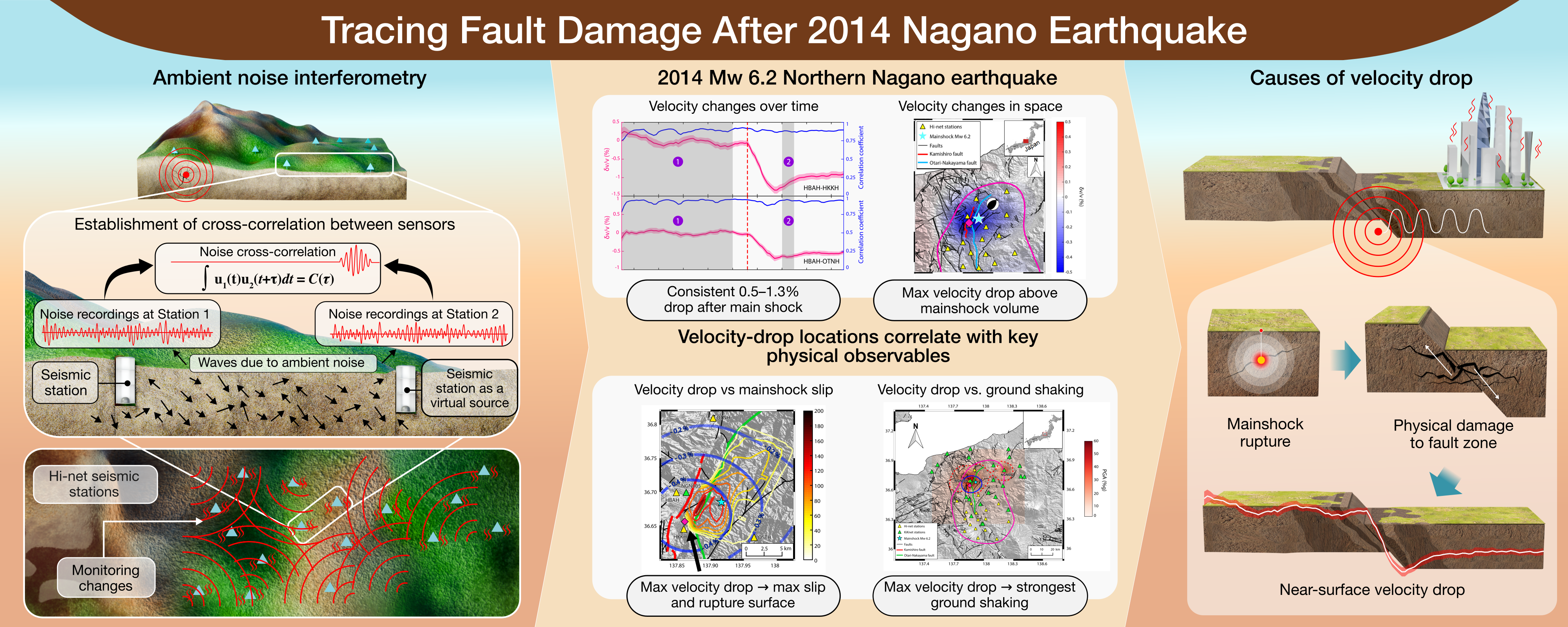 Our recent Nature Communications Earth and Environment paper, “Fault zone damage caused by the mainshock rupture during the 2014 Northern Nagano earthquake,” explores how the shallow crust responded to this event — not just at the surface, but also at depth. Using a technique called ambient noise interferometry, we uncovered how seismic waves slowed down by up to 1.3% in the crust after the earthquake, revealing zones where rocks had been damaged by the violent rupture.