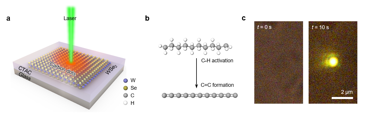 Here, we discovered that C-H activation in long-chain molecules can be facilely enabled by light and 2D materials. As shown in Figure 1, by putting organic molecules (e.g., cetyltrimethylammonium chloride, polyethylene) on a monolayer transition metal dichalcogenide, such as WSe2, WS2, or MoS2, we can use low-power laser to convert these compounds into bright carbon dots. This process involves the WSe2-mediated C-H activation followed by subsequent C=C bond formation.