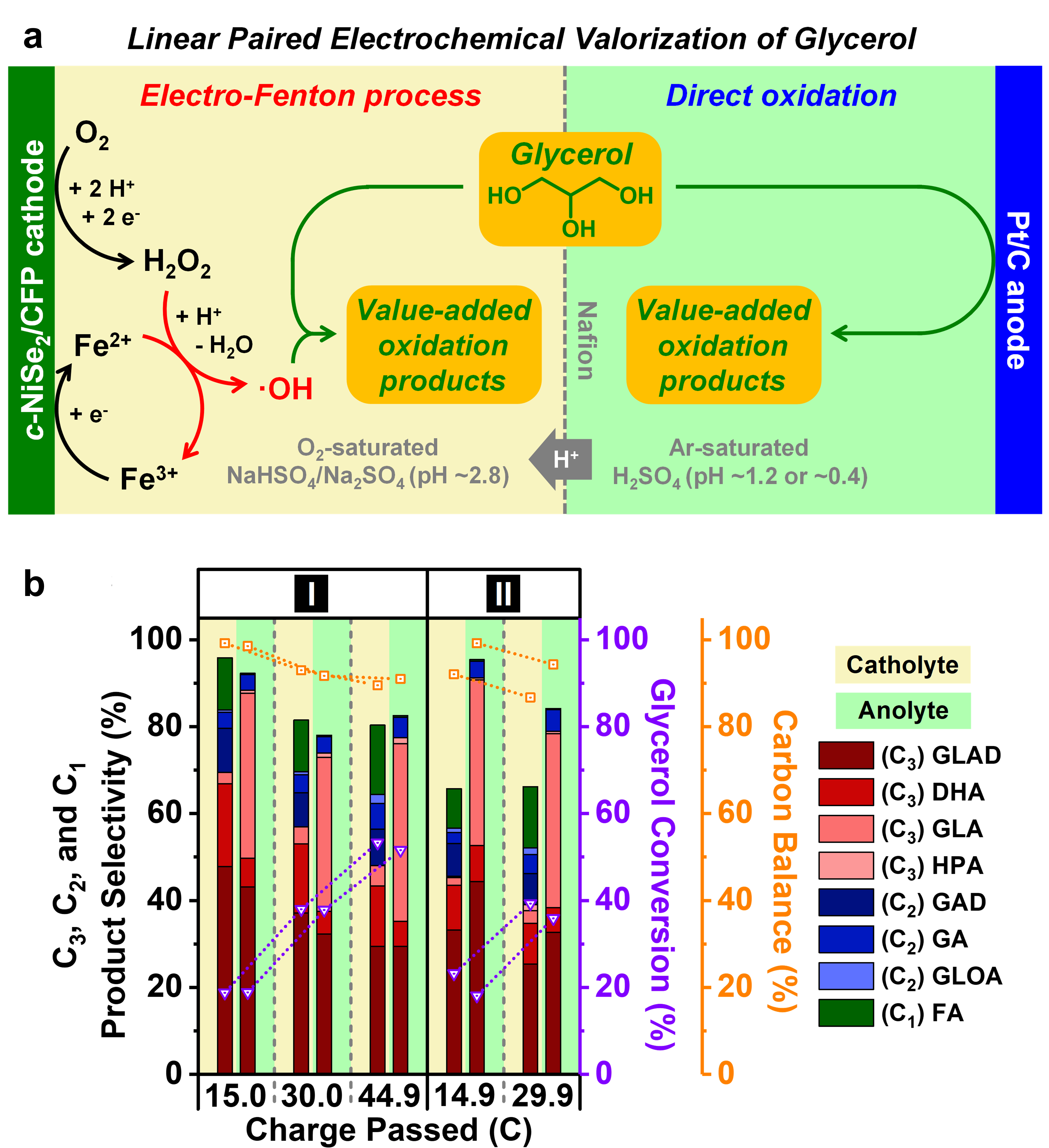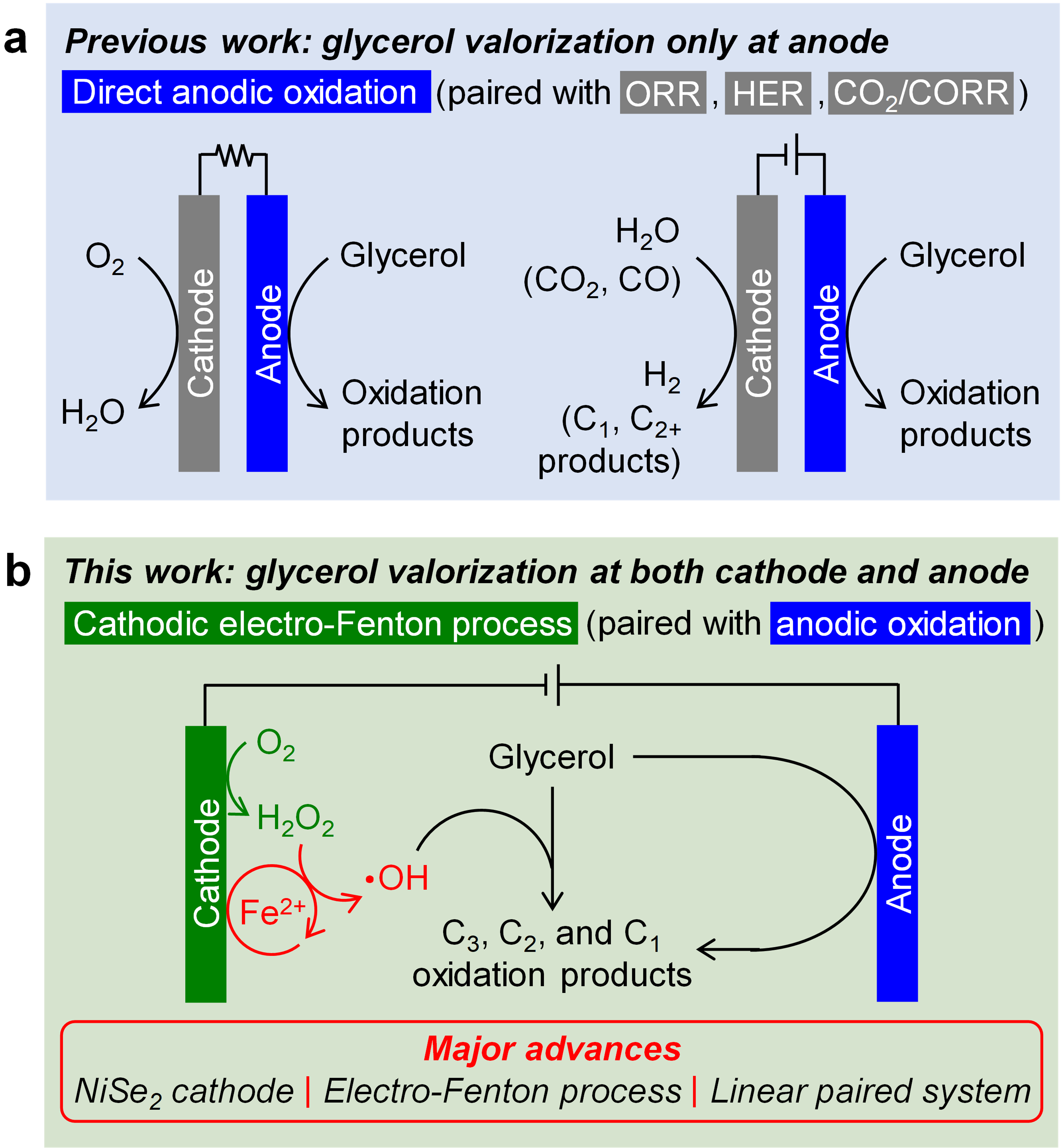 Now, writing in Nature Catalysis (https://doi.org/10.1038/s41929-022-00826-y), we report a new approach of cathodic valorization of glycerol into mainly C3 and C2 oxidation products at an earth-abundant metal compound-based NiSe2 electrocatalyst, where H2O2 is electrogenerated from the selective two-electron oxygen reduction reaction (2e ORR) in acidic solution, and then undergoes the Fe2+-mediated electro-Fenton process and gets converted into the highly oxidizing hydroxyl radical (·OH) that is responsible for glycerol oxidation in the catholyte. This novel cathodic valorization of glycerol enabled by the electro-Fenton process further allows for linear pairing with anodic oxidation to produce the same glycerol-derived oxidation products concurrently at both cathode and anode using glycerol as the sole feed, which we demonstrated in a proof-of-concept linear paired electrochemical system shown in Figure 1b.