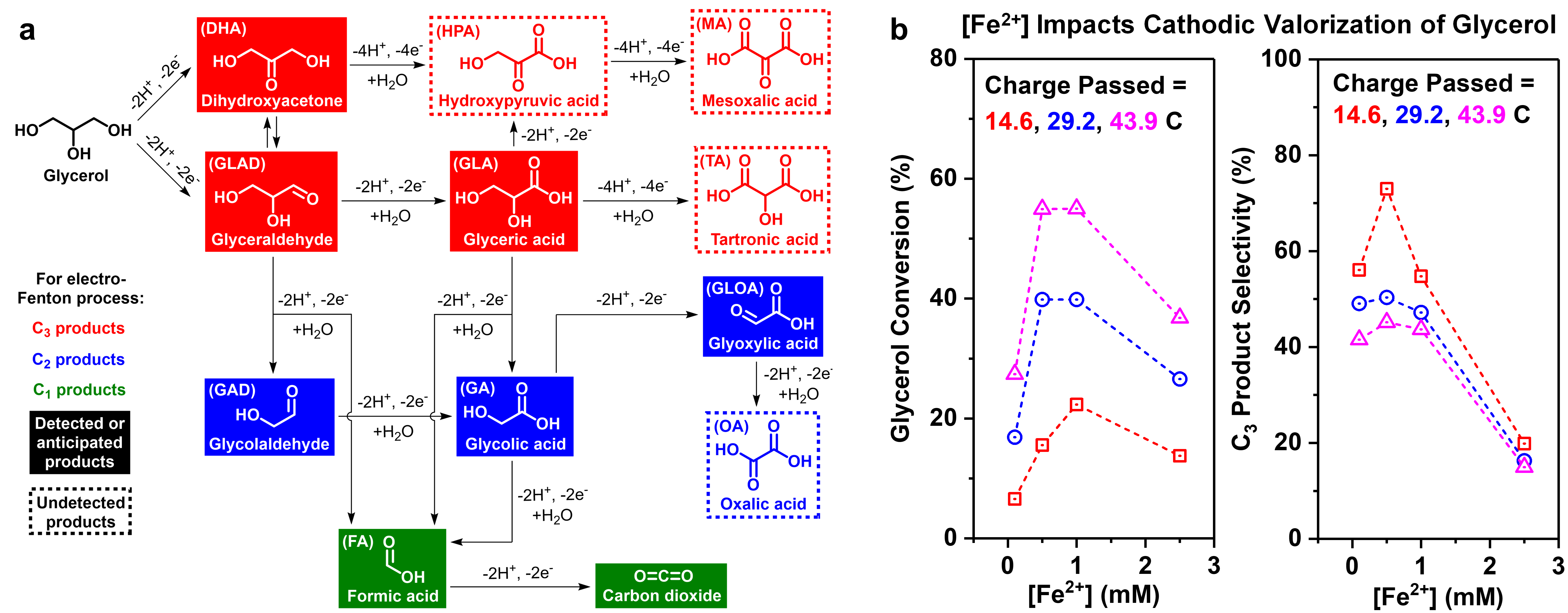 Figure 3. (a) Glycerol oxidation pathway. (b) The impact of Fe2+ concentration on cathodic valorization of glycerol at NiSe2 cathode via the electro-Fenton process, where both the glycerol conversion percentage and the C3 product selectivity are affected.