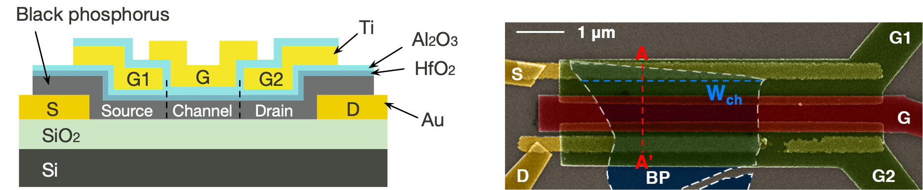 Our journey with black phosphorus (BP) started in a project working on building tunnel field-effect transistors (TFETs) using 2D materials. One of the key challenges was to introduce doping in BP, since a TFET requires a p-i-n doping profile. However, doping in 2D materials has always been an issue, as traditional ways of introducing substitutional dopant atoms – ion implantation or diffusion – remains challenging for atomically thin 2D materials. We ended up with a solution using multiple gates to introduce the desired doping profile in different segments of the BP channel by electrostatic doping and demonstrated a BP TFET. We also found that if we change the doping profile of the BP device by changing the combination of gate biases, we can reconfigure the device into a TFET or a MOSFET, and into a p-type device or an n-type device. The work was later published in ACS Nano.