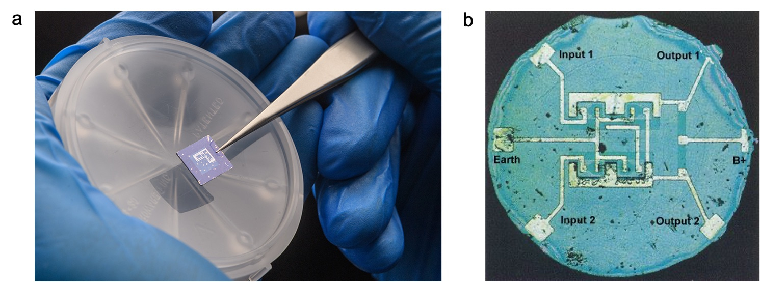 After a few rounds and iterations of improving device structures (which actually took more than a year), we finally reached optimized device performance – near ideal SS, good on-off ratios, low-voltage operation, good symmetry between p-type and n-type characteristics – everything looked great on the single device level. The next step was to wire up these transistors to form a working circuit. Since we used scotch-tape exfoliation to transfer the BP flakes onto the substrate, the transistors were scattered around at different locations on a 1 cm × 1 cm silicon chiplet. As a result, we had to make wires that are millimeters long and tens of micrometers wide to connect these transistors – so wide that they can be seen with the naked eye. Of course, this is sort of an ad hoc solution for the prototype circuit and a tighter integration should be explored, but it does give us a feel of the ‘good old days’ when the monolithic silicon IC was first invented, when everything was brand new and in a rough shape, and we hope that one day our design could also grow into something big.