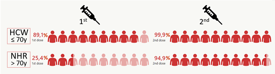 In both cohorts, we identified a total of 7 non-responders, defined as participants who did not reach anti-spike IgG positivity after 2 vaccine doses. The only non-responder in the HCW cohort received immunosuppressant medication, representing 0.1% of the total 948 naïve. Among the 6 non-responders in the NHR cohort, representing 5% of the total 118 participants, 3 were men and 3 women and lack of anti-Spike IgG positivity was neither associated with medication or frailty.