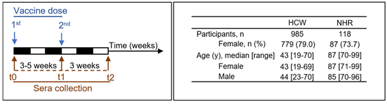 Blood samples were collected before vaccination (t0), 3-5 weeks after the 1st dose (t1), and 3 weeks after the 2nd dose (t2) of BNT162b2 mRNA COVID-19 (Comirnaty, Pfizer/BioNTech), see Figure 1. Spike-specific IgG, IgM, and IgA were measured by a semi-automated in-house ELISA assay. Anti-RBD total Ig was also measured in the HCW group. 297 HCW and 28 NHR participants were lost to follow-up or were excluded due to a positive PCR result for SARS-CoV-2 during the study.