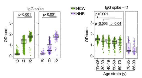 Stratification of the results by age revealed a negative effect of age on the IgG levels (see Figure 3) measured 3 weeks after the 1st dose (t1). The same effect was observed for anti-Spike IgM and for anti-RBD Ig. IgG levels were significantly lower in NHR participants than in the oldest HCW participants (aged 60-70 years), but there was no difference in IgG levels between the 70-85 and the 86-99 age groups in the NHR cohort. No age effect was observed for IgA levels.