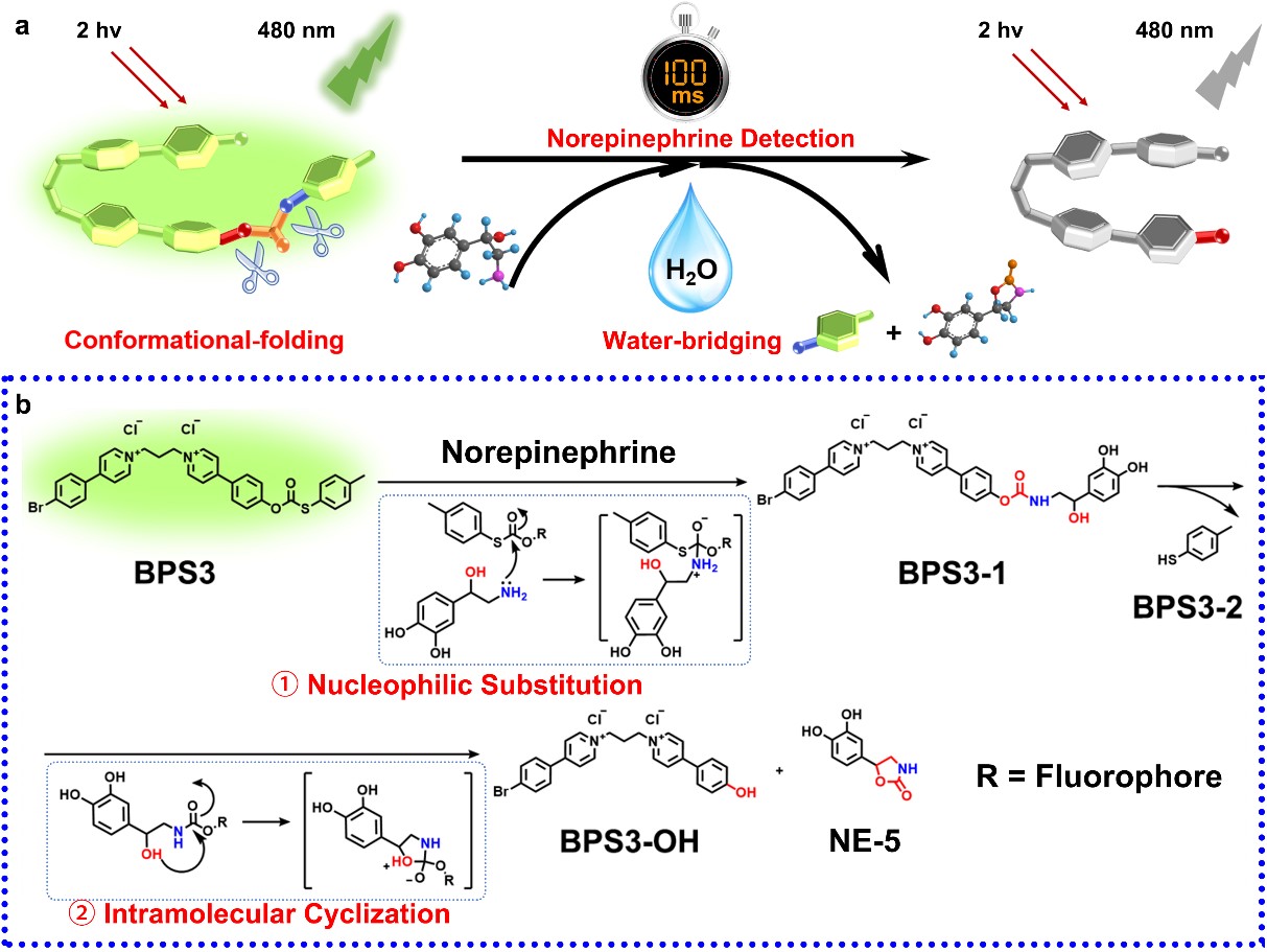 The results presented here not only provided a superior molecular imaging tool for NE detection that is beneficial for advanced neuroscience research, but also revealed a dual acceleration mechanism that may further bring new inspiration to biological, analytical, organic, and physical chemists in the study of ultrafast detections and reaction kinetics regulations.