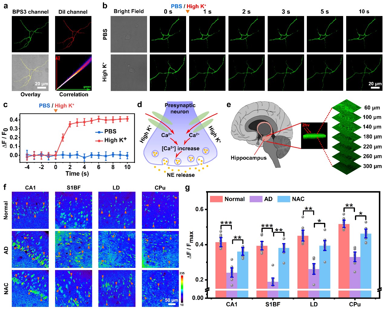 Finally, benefiting from the superior properties including high specificity, nanomolar sensitivity, neuronal cytomembrane-labelling and 100-ms temporal resolution, as well as near infrared (NIR) two-photon excitation, we applied probe BPS3 to real-time imaging of NE fluctuations in living neurons under external chemical stimulation. The rapid and significant fluorescence variations at the neuronal cytomembrane clearly indicated the transient neuronal NE cytosolic process (within 2 s) upon high potassium stimulation, validating the high spatiotemporal resolution of the probe, which was very beneficial for in-depth studies of the transient NE dynamics and functions during physiological processes in living neurons. Moreover, by two-photon fluorescence imaging of acute mouse brain tissue slices, we revealed the close correlations between downregulated NE levels and AD pathology as well as antioxidant therapy.