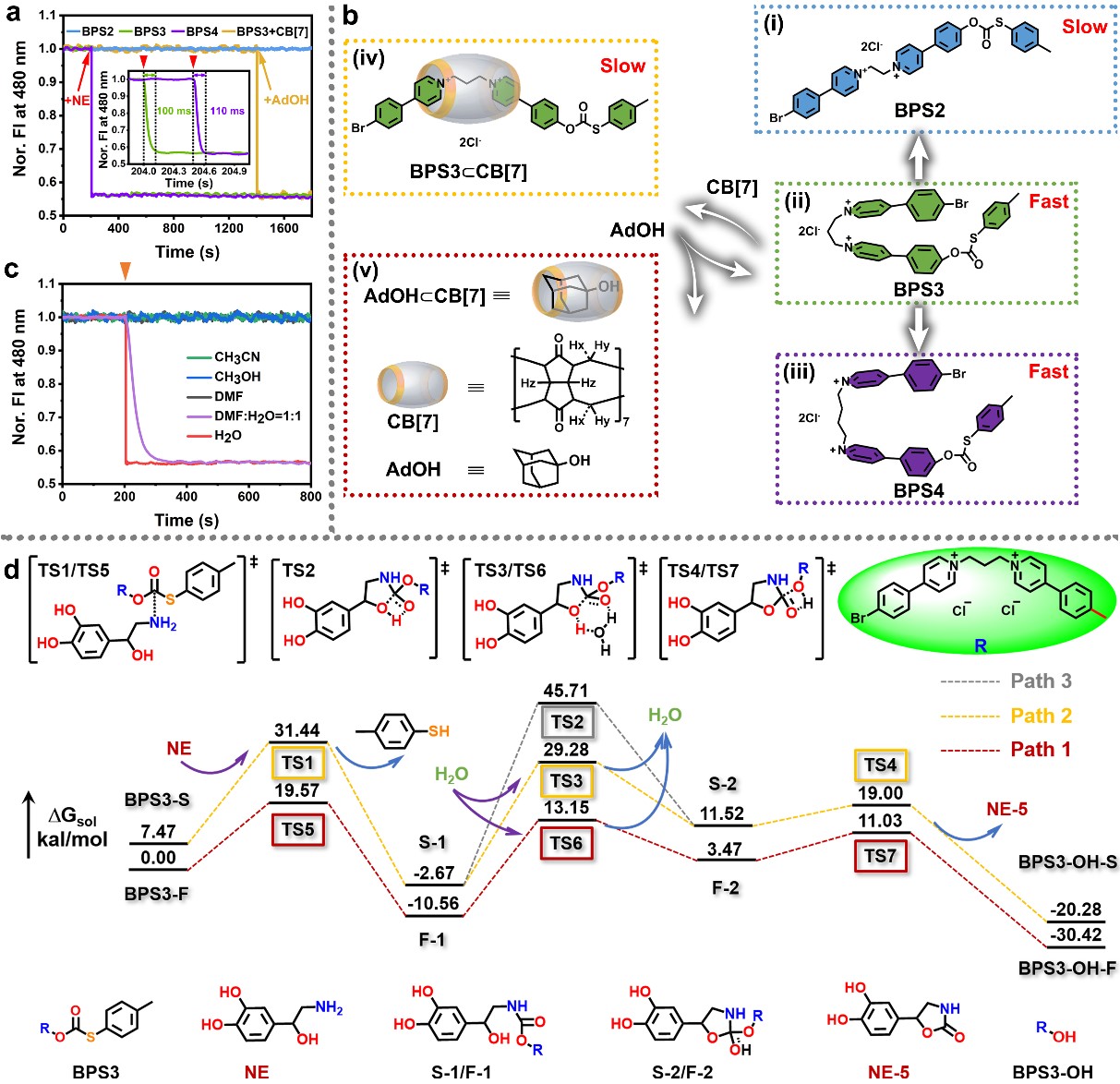 Through experiments and theoretical analysis, we revealed a unique dual acceleration mechanism, namely molecular conformational folding and water bridging. Through the study of molecular conformational regulation, it is confirmed that the reaction rate of the probe is more than 105 times higher in the folded conformation than in the stretched conformation (Figure 2a, b). On the other hand, through the analysis of the reaction transition states, it is proved that water molecules participate in the formation of a six-membered-ring transition state, which promotes the process of intermolecular proton transfer, thereby effectively reducing the reaction energy barrier. Experimental results demonstrate that the reaction rate of the probe is 103 times higher in the water environment than that in the anhydrous environment (Figure 2c, d).