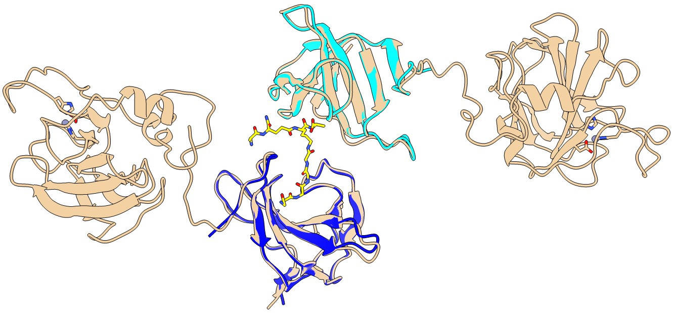 Figure 1. Context of ligand-binding in relation to full-length lysostaphin. Our dual SH3b domains (light and dark blue) bound to ligand (yellow, stick form) were used as a basis to superpose the full-length structure of lysostaphin (two monomers taken from PDB 4LXC, coloured tan, active site and Zn ion in stick form and sphere, respectively). In this conformation, lysostaphin activity would act quite distal to the SH3 ligand-binding interface