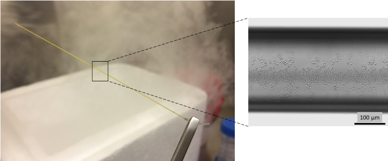 Silica micro capillary containing Cryptosporidium parvum oocysts before plunging into liquid nitrogen.