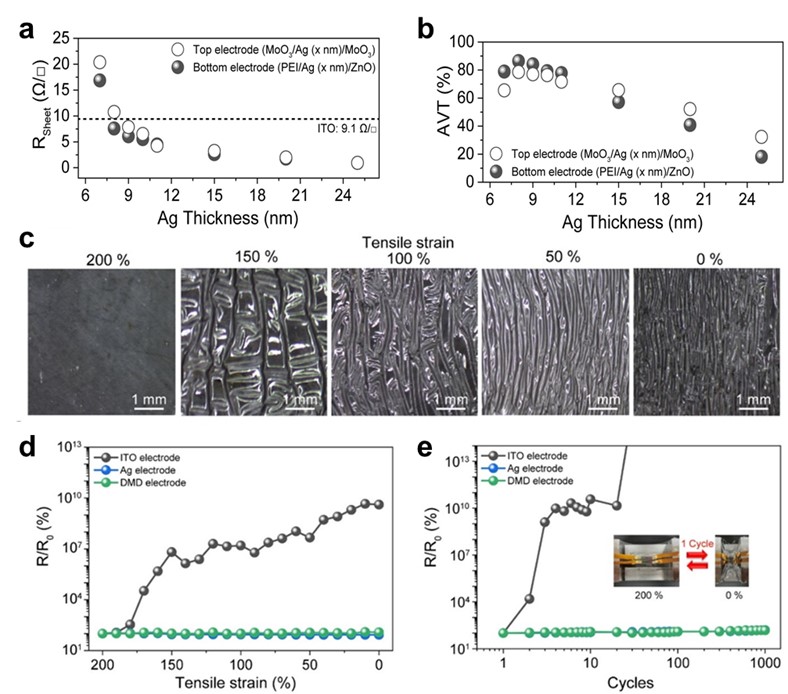 Fig. 2. a, Comparison of Rsheet according to Ag layer thickness in PEI/Ag/ZnO (5/x/50 nm) and DMD (5/x/30 nm) electrodes. e, Comparison of AVTs according to Ag layer thickness in PEI/Ag/ZnO (5/x/50 nm) and DMD (5/x/30 nm). b, Comparison of AVTs according to Ag layer thickness in PEI/Ag/ZnO and DMD electrodes.c, Images of ultrathin PEI/Ag electrodes laminated into polymeric elastomer from pre-stretched condition (tensile strain of 200%) to compressed condition (tensile strain of 0%) in tensile strain steps of 50%. Change in resistance in the ITO, PEI/Ag, and DMD electrodes d, under a series of compression and e, after repetitive cycles of compression–release.