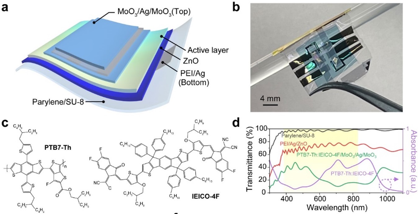 Fig. 1. a, Schematic of device structure and b, photograph of ultra-flexible ST-OPV. c, Chemical structures of donor polymer, PTB7-Th, and non-fullerene acceptor, IEICO-4F. d, Absorbance spectra of PTB7-Th : IEICO-4F film (purple) and transmittance spectra of glass/parylene/SU-8 (black), PEI/Ag/ZnO (red), PTB7-Th:IEICIO-4F/MoO3/Ag (8 nm)/ (green).