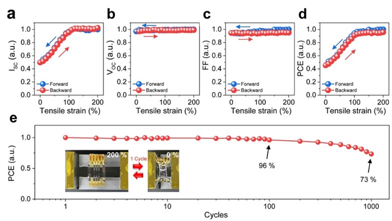Fig. 3. Changes in photovoltaic parameters of a, VOC, b, ISC,0 c, FF, and d, PCE under forward and backward compression. e, Change in PCE of ST-OPVs under repetitive cycles of compression–release.