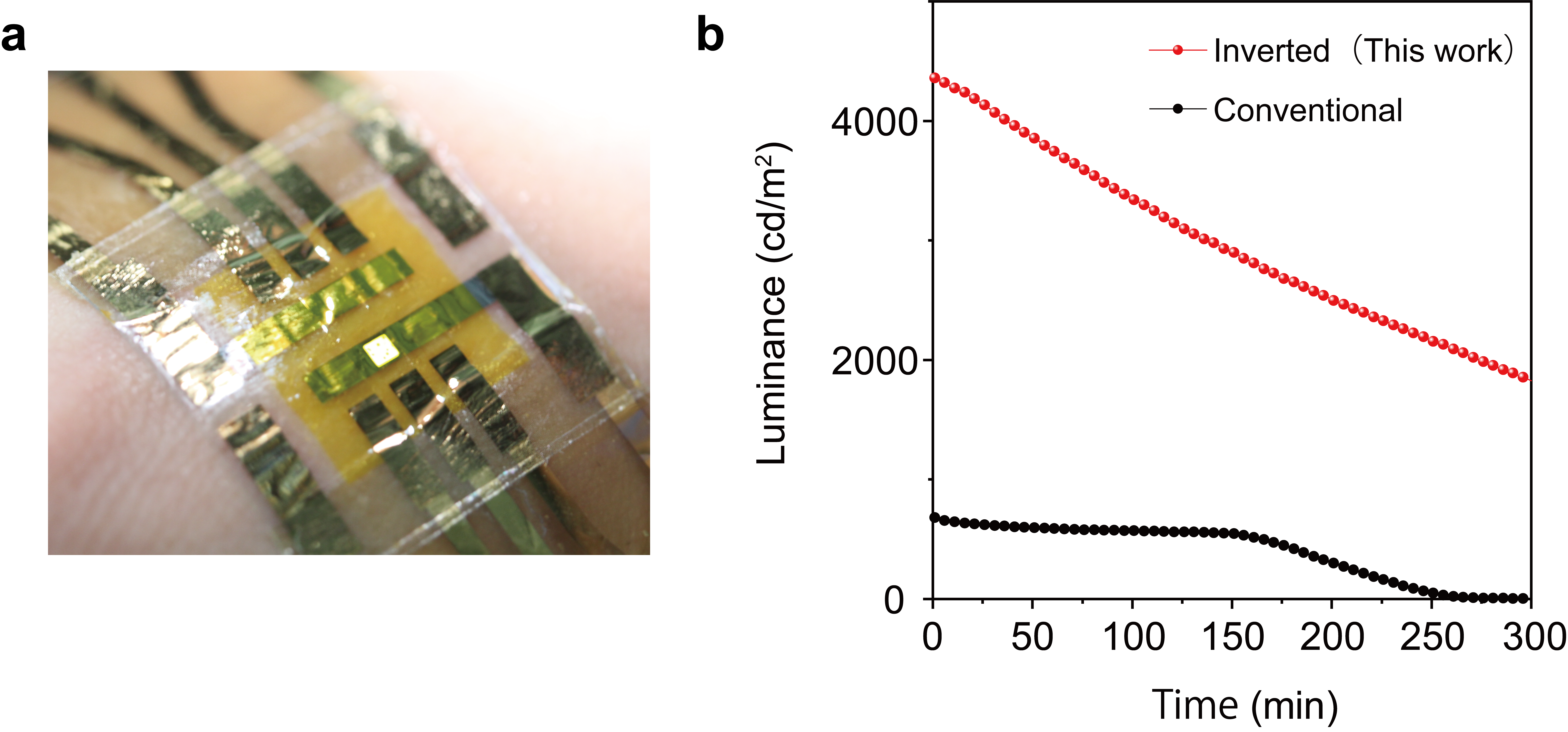Furthermore, with adopting an air-stable inverted structure and a doped polyethylenimine ethoxylated layer, ultraflexible polymer light-emitting diodes maintain 70% of the initial luminance even after 11.3 h of constant operation under air (Fig. 2a). Compared to the conventional Aluminum/Sodium Fluoride cathode devices, our inverted PLED shows an improvement by a factor of 7 during measurements at a constant voltage of 8 V under air (Fig. 2b).