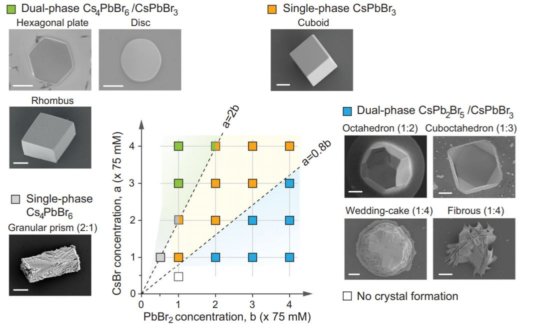 I ran into the office of my advisor, Prof. Seok-Hyun (Andy) Yun, to discuss on what I observed. He and I put nickname on it as "ultrasonic magic". Few questions were arisen: 1. if this particle is CsPbBr3 perovskite, how can these particles stay stable in polar DMF solvent even after ultrasonication since CsPbBr3 is well known to be dissolved in a polar solvent? 2. what will happen if we mix different concentration ratios of salts? After investigation, we understood this phenomena as the spontaneous nucleation and growth of CsPbBr3 in supersaturation by the help of ultrasonic bubbles. Also, by adjusting precursor concentrations, we could build a two-dimensional concentration phase diagram of different perovskites materials including high-luminescent perovskite-embedded dual-phase microcrystals (Photoluminescence quantum yield > 40 %) . Our new synthesis method enabled us to visualize the lattice alignments in the dual-phase composites and supports the claim of CsPbBr3 nanocrystals being the photoluminescent sites, which has been in confusion (3).