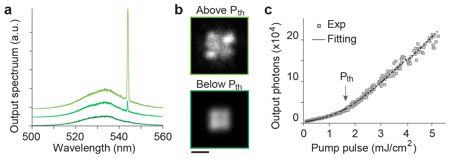 Finally, we tested lasing performance of sonochemically prepared CsPbBr3 microcrsytals. Above certain threshold energy, bright scattering spots, narrow linewidth emission, nonlinear light-in-light-out curve proved lasing of CsPbBr3 microcrsytals. High structural quality enables us to demonstrate lasing of CsPbBr3 microcrystals as small as 2 µm in size. In summary, we discovered our novel sonochemical method to produce a large quantity (10 billions/L) of high-quality perovskite micro-laser particles in a polar solvent within 2 minutes, and provides insights into the unique structure of perovskite- embedded dual-phase microcrystals.