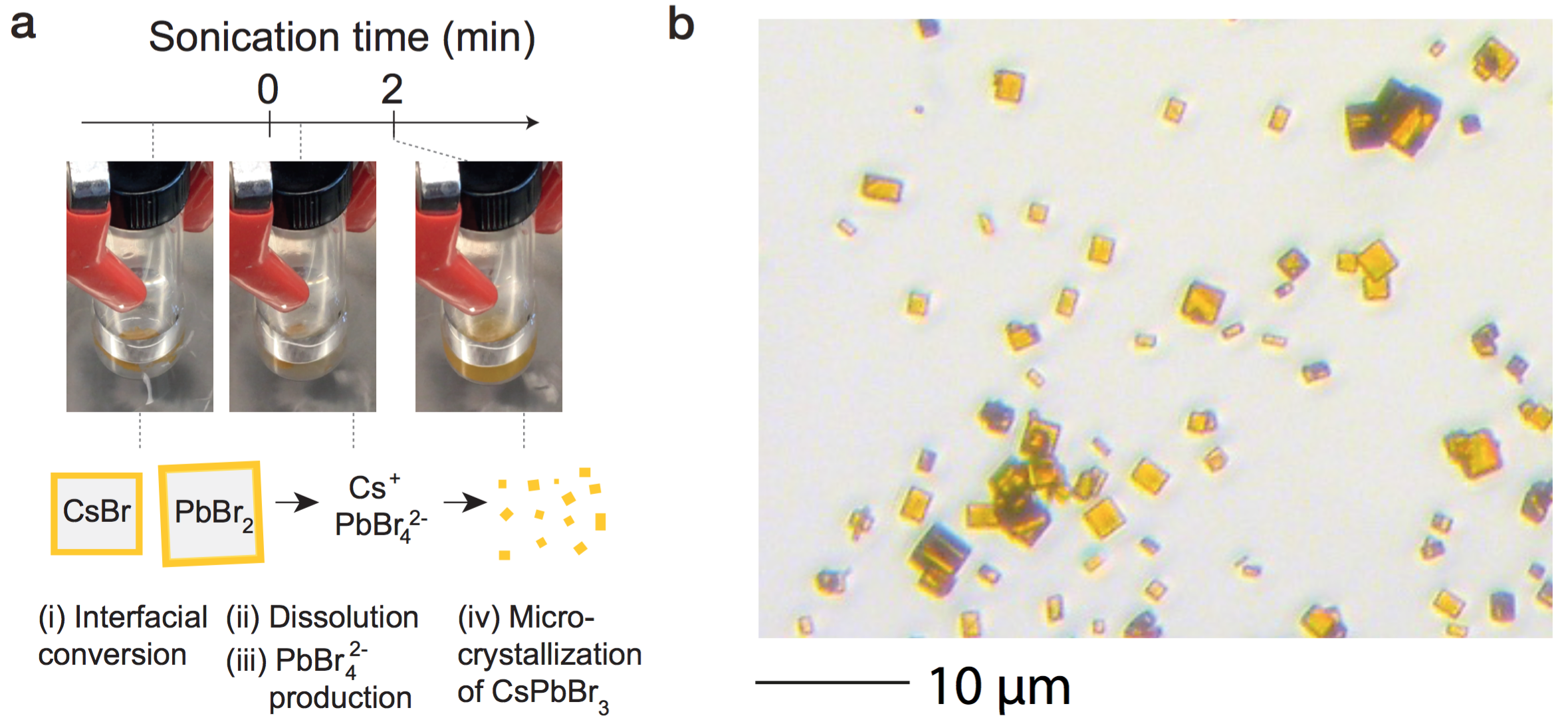 I clearly remember the day I observed, so called, "ultrasonic magic" in a lab (1). It was an ordinary afternoon in November of 2017 and I was testing different ideas to make better quality lead halide perovskite (APbX3, A=Cs+, CH3NH3+, X=Cl-, Br-, I-) microcrystals for micro-laser applications. One of the conventional methods for perovskite microcrystals is dissolution-relocation growth (2) consisting of two consecutive steps: 1. Deposit PbX2 salts on the glass substrate, 2. Immerse the substrate into AX solution. It takes about 20 hours for growing complete micron-size nanowires and microplates. For further use, the detachment of these structures from the substrate is necessary, but unfortunately, this may generate structural damages, which are potentially vulnerable to efficient lasing.