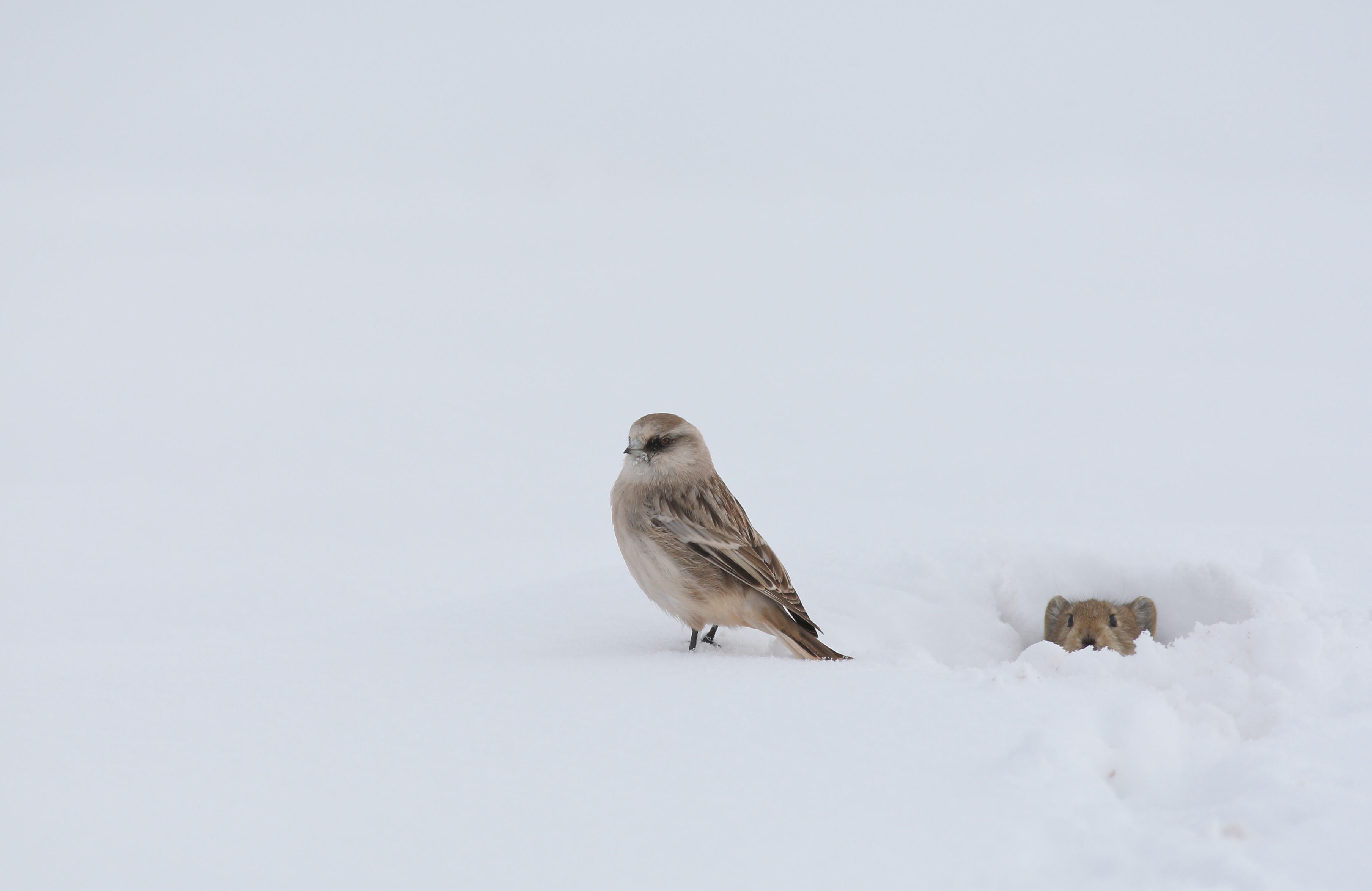 After a heavy snowfall, a white-rumped snowfinch jumped from pika’s burrow to the ground and subsequently, a plateau pika slowly poked its head out of the hole. Credit: Zhao Chao
