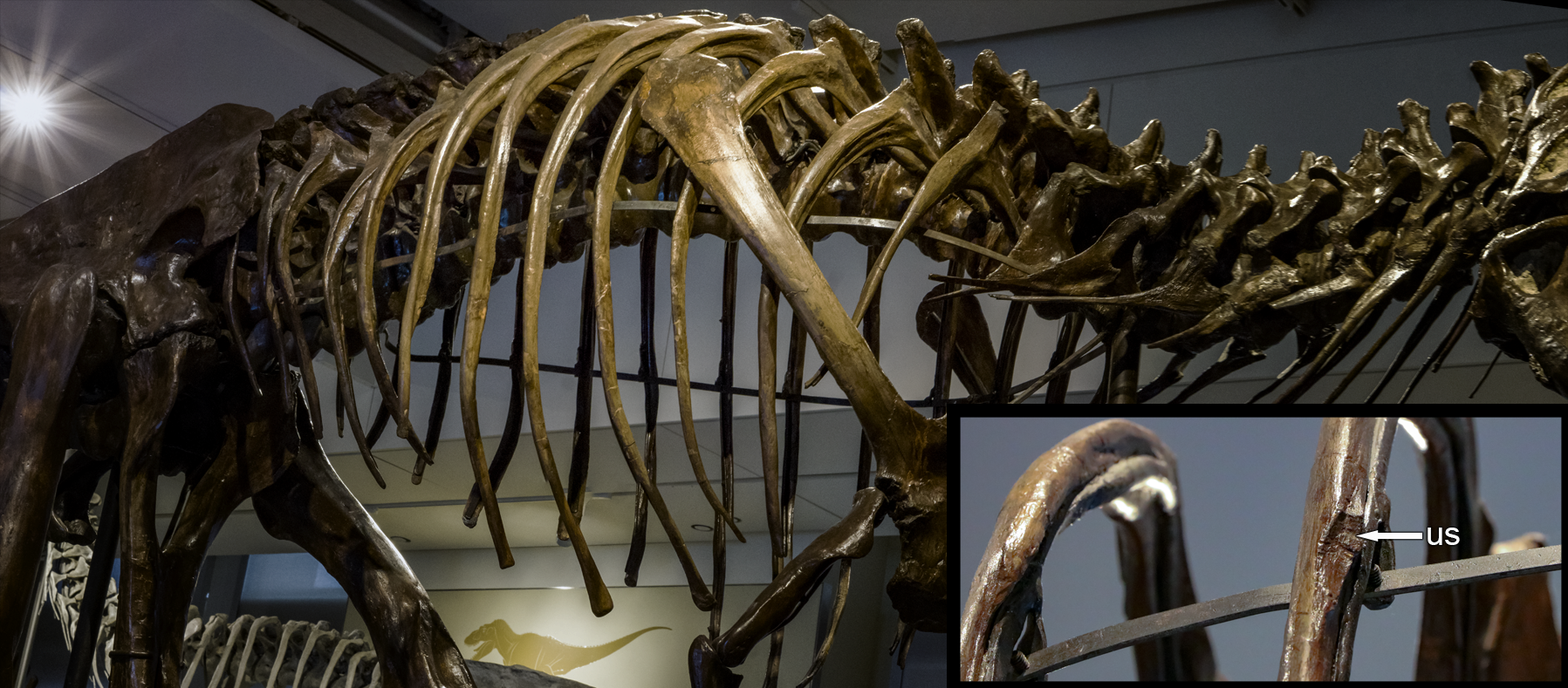 At the Canadian Museum of Nature in Ottawa, a skeleton of the tyrannosaurid Daspletosaurus torosus was on display in the centre of the dinosaur gallery. As I passed through a crowd of visitors and looked at D. torosus from the side, uncinate scars on five consecutive ribs gradually revealed themselves to me. The previously undescribed scars had been hidden in plain sight, as that D. torosus mount has been on display since the 1970s!