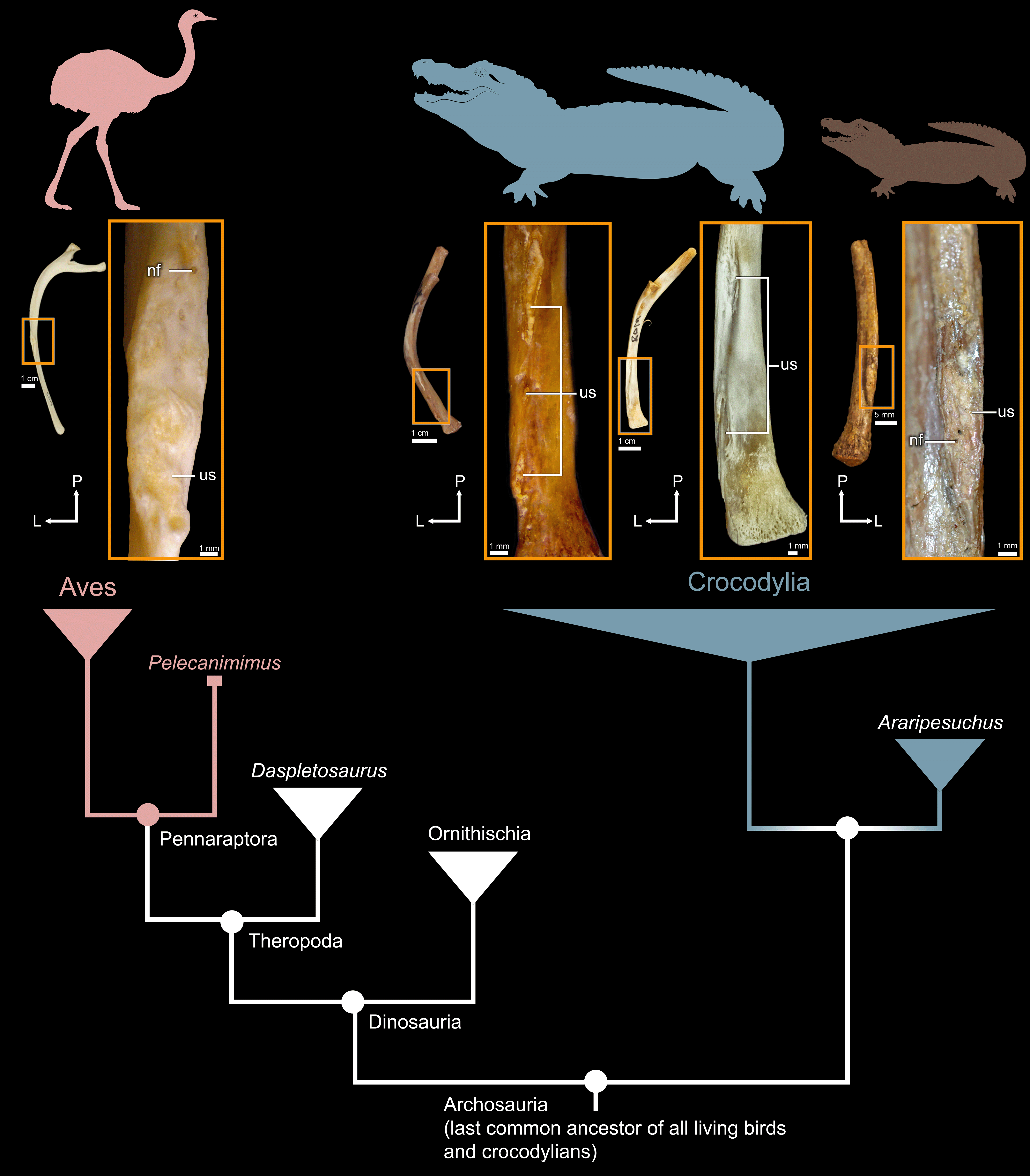 In 2016, my coauthor Corwin Sullivan and I paid a research visit to the Evolutionary Studies Institute at the University of the Witwatersrand in Johannesburg. At that point we were just getting interested in uncinate processes, and in the possibility that they might have once been common in extinct archosaurs. We pulled some ribs of a modern Nile crocodile out of a drawer in the Institute’s fine anatomical collections, and saw exactly what we’d been hoping for – distinct facets, which we soon took to calling “uncinate scars”, on the edges of the ribs where cartilaginous uncinate processes had once been attached. If we could find similar scars on the ribs of extinct archosaurs, we could deduce that they must have had uncinate processes too, even if the processes themselves weren’t preserved.