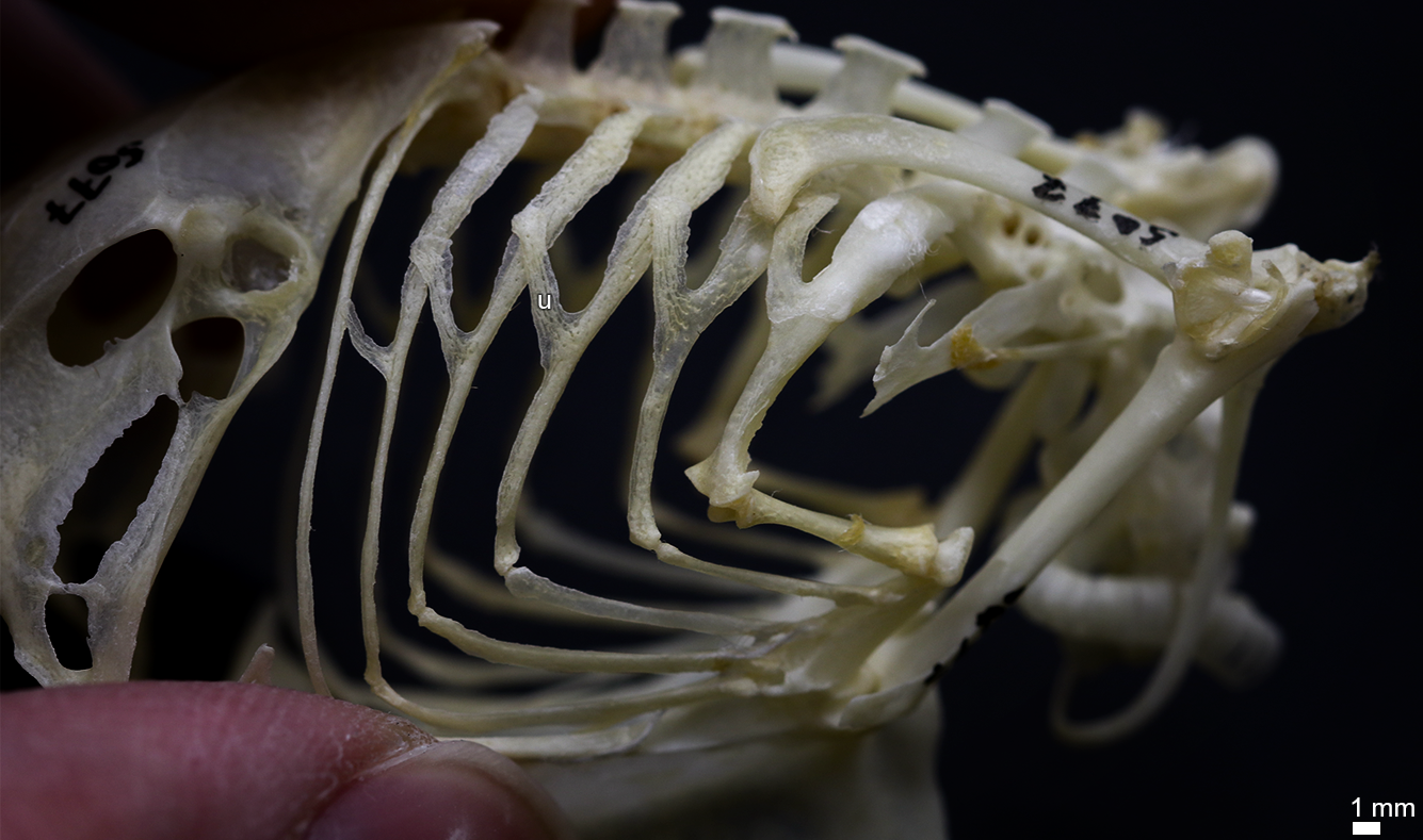 Almost all birds alive today, with the minor exceptions of the Australasian incubator birds and the South American screamers, have hook-like bony prongs protruding backwards from several successive pairs of ribs in the shoulder region. Scholars and their students have been pondering the possible function of these structures, called uncinate processes, for centuries, with structural reinforcement of the ribcage and enhancement of ventilation as the most common hypotheses. Nearly two decades ago, the ventilatory hypothesis received important experimental support from a study carried out in the Canada goose by J. R. Codd and some colleagues. Perhaps, their work suggested, the uncinate processes of birds act like levers, contributing to the ability of the trunk muscles to pump air into and out of the body. Crocodylians, the closest living relatives of birds, have uncinate processes too, but crocodilian uncinate processes take the form of soft, cartilaginous tabs rather than rigid bony hooks. How crocodylian uncinate processes might function, and whether these structures have a common evolutionary origin with the uncinate processes of birds, are open questions.