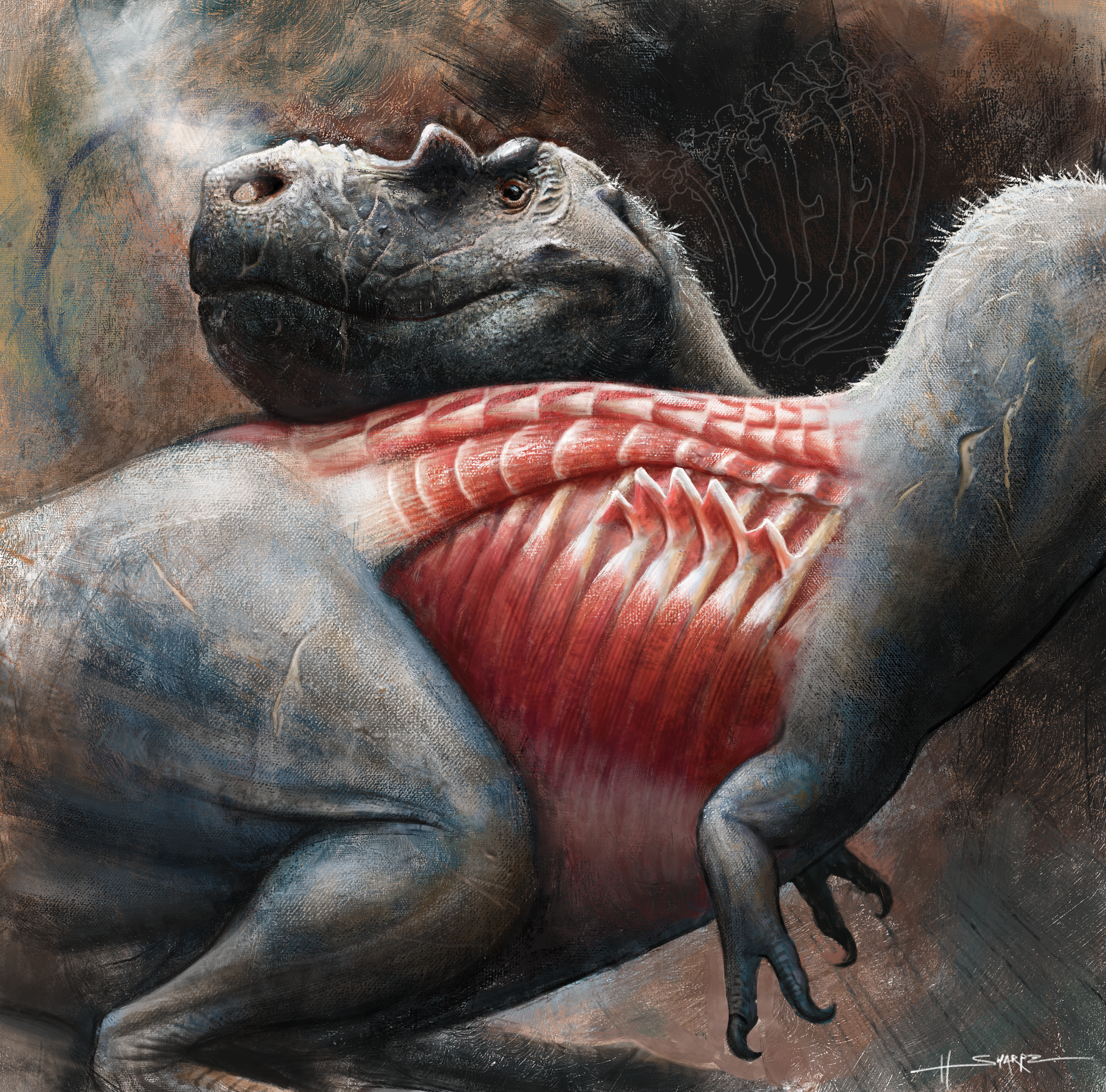 This finding raises the question of why ancestral archosaurs needed uncinate processes in the first place. Could early archosaurian uncinate processes have played a role in ventilation, like their counterparts in modern birds? A 2019 study carried out in the American alligator, again led by J. R. Codd, provided interesting empirical evidence that this might have been the case. Crocodylian uncinate processes are largely embedded in a back muscle, the iliocostalis, and Codd and his coauthors showed that this muscle is activated during exhalation. When an alligator is breathing hard, they wrote, contraction of the iliocostalis appears to force the ribs to swing “inwards and backwards”, helping to drive air out of the lungs. Assuming that the uncinate processes help enable the iliocostalis to rotate the ribs, as seems likely, this discovery demonstrates that a ventilatory function for uncinate processes is not confined to birds and may even have been present in the common ancestor of all archosaurs, which is also the most recent common ancestor of birds and crocodylians.