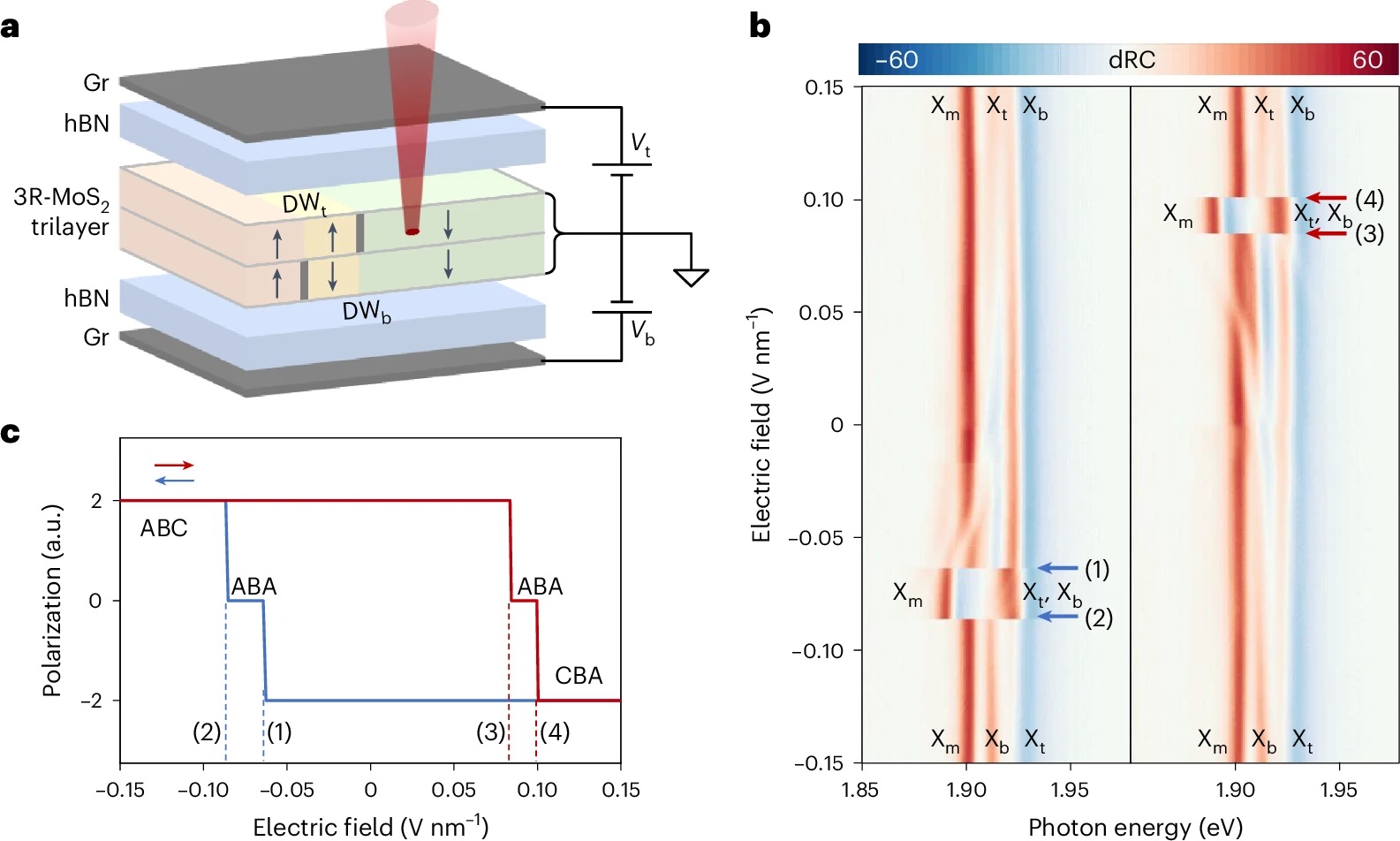 Figure 1. Polarization switching in a 3R-MoS2 trilayer involving ABA stacking as the intermediate state.