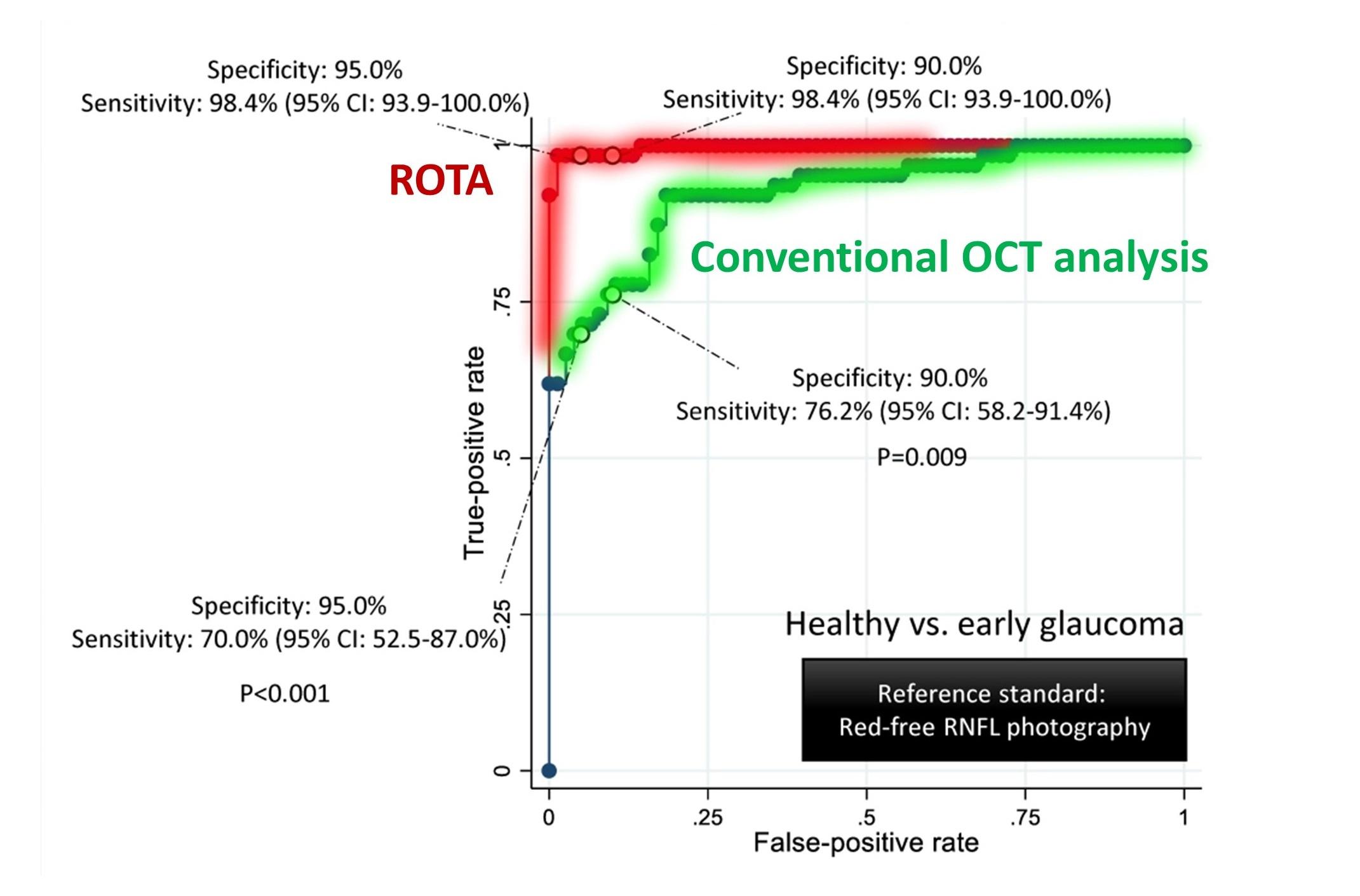 Does ROTA make a difference in clinical care? To validate the performance of ROTA, we examined a consecutive series of 363 patients with glaucoma and 177 healthy participants to compare the diagnostic performance of conventional OCT analysis versus ROTA for detection of glaucoma. ROTA attained significantly higher specificity and sensitivity to detect RNFL defects in early glaucoma compared with RNFL thickness and ganglion cell inner plexiform layer (GCIPL) thickness analysis. Furthermore, ROTA was able to unravel specific patterns of RNFL loss in compressive optic neuropathy, optic neuritis, and non-arteritic anterior ischemic optic neuropathy that are difficult to determine from red-free photography or RNFL/GCIPL thickness analysis. Implementing ROTA in clinical care can augment the diagnostic capacity to identify patients with early disease for treatment.