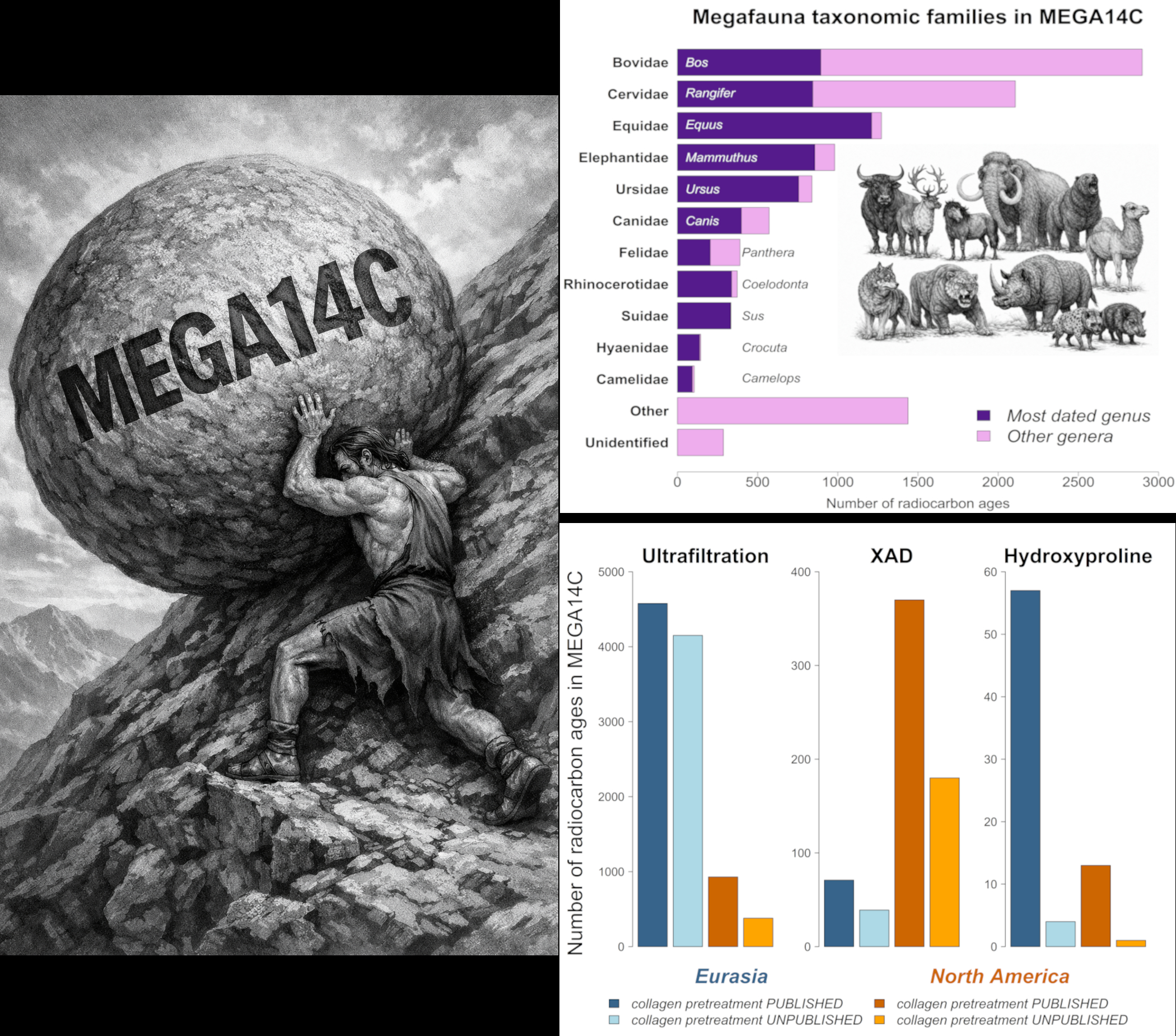 MEGA14C is a dataset of radiocarbon ages for Holarctic megafaunal mammals, curated by collagen pretreatment method, and compiled over 7 years of heavy-lifting work - as symbolized by the myth of Sisyphus (image on the left). To the right, the top barplot ranks mammal families according to the number of radiocarbon ages in the dataset, with the dominant genus indicated for each family. The lower barplot shows the number of radiocarbon ages collated by pretreatment, revealing that approximately 50% lack published pretreatment information. Regional differences in pretreatment use reflect historical and geographic practices rather than methodological accuracy: ultrafiltration and hydroxyproline are more common in Eurasia, whereas XAD purification was developed and has been primarily applied in North America. |