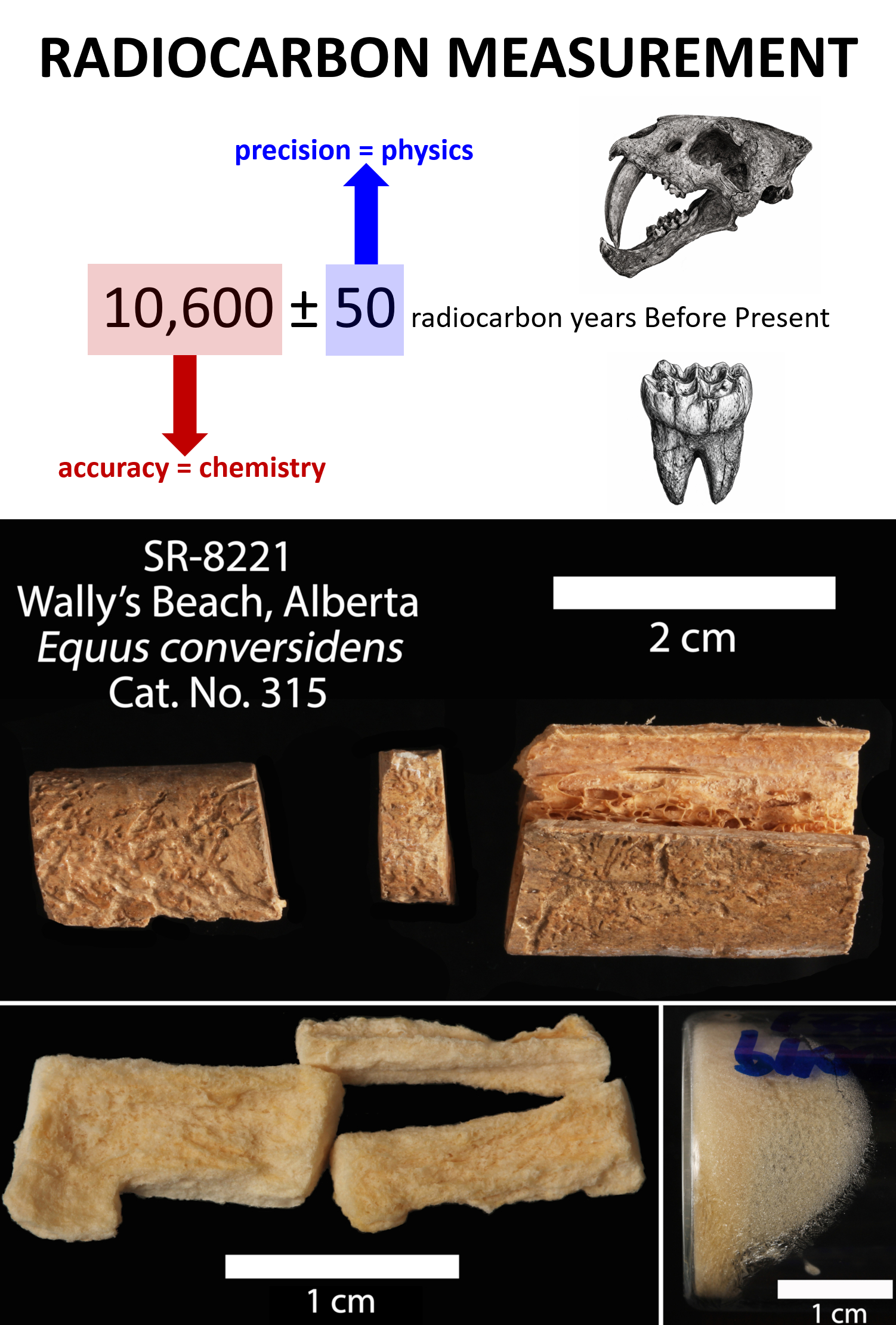 | Accuracy and precision in radiocarbon measurements. Radiocarbon ages are typically reported as a value with an associated uncertainty—for example: a fossil tooth dated at 10,600 ± 50 radiocarbon years Before Present. The uncertainty (± 50 years) reflects precision and relies on the physics of the radiocarbon measurement: the statistical error of counting radiocarbon atoms in a particle accelerator. The age itself (10,600 years), however, reflects accuracy and relies on the chemistry of the radiocarbon measurement: whether the radiocarbon atoms being counted truly belong to the fossil tooth OR a fraction was incorporated from the burial environment after the animal’s death. If chemical collagen purification does not fully remove contamination, the particle accelerator will count both endogenous and exogenous radiocarbon as if it were native to the sample. As a result, contamination can shift apparent fossil ages by decades to millennia, leading to fossils and species being placed in incorrect climatic, ecological and human contexts. |