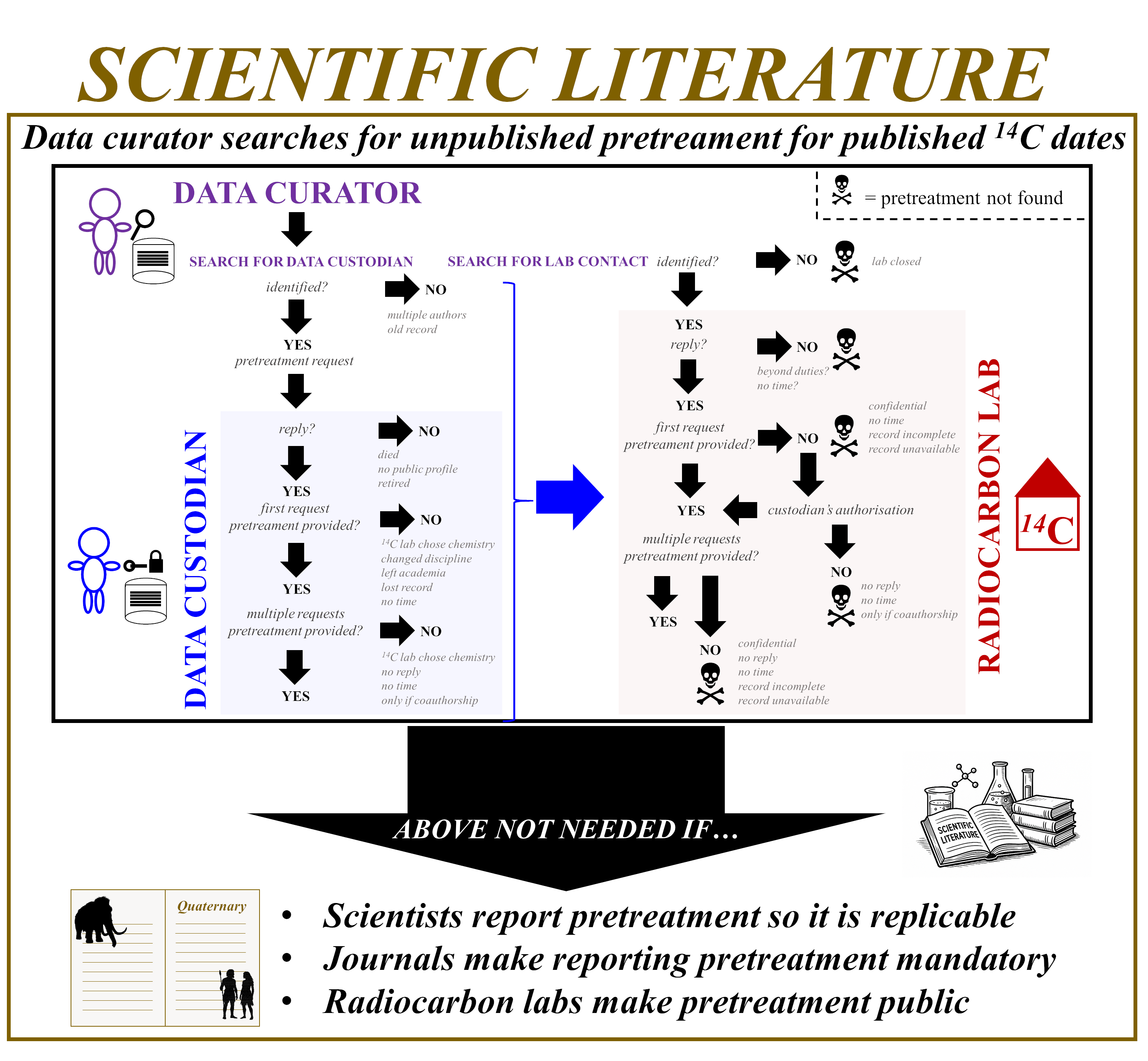 | Tracking down unpublished pretreatment information for MEGA14C. The process usually involves three parties: the data curator (that’s me, compiling the dataset), the data custodian (the person who owns the data, usually the one who funded the dating or submitted the samples), and the radiocarbon lab. The curator starts by contacting the custodian, and if that fails, reaches out to the lab. A black-skull symbol marks a “dead end”, where the trail goes cold and the pretreatment information cannot be recovered. This figure, published in Scientific Data, summarizes arguments from the companion paper published in the Journal of Quaternary Science. |