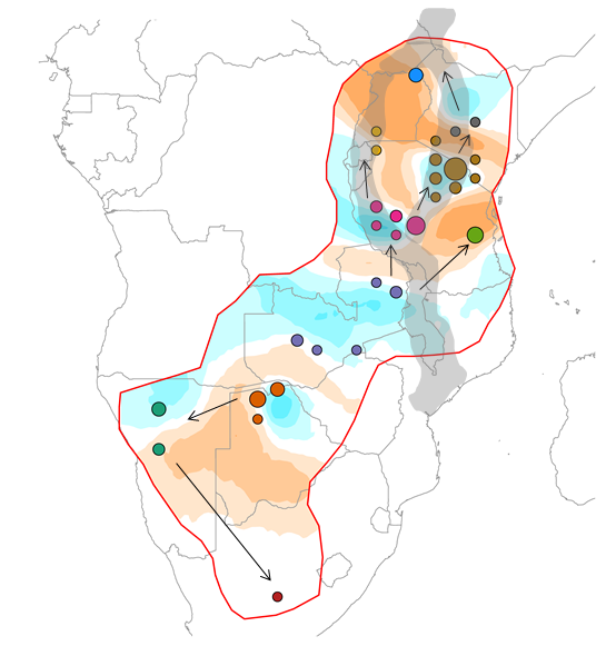 Strikingly, we found strong evidence that the northeast-wards migration followed three distinct routes, two following the two branches of the Great Rift Valley through Tanzania, and a third one going south of Lake Malawi and entering southeastern Tanzania from Mozambique. We identify several populations which have reduced genetic diversity relative to the rest, two of which are not represented as individual entities in the subspecies scheme.