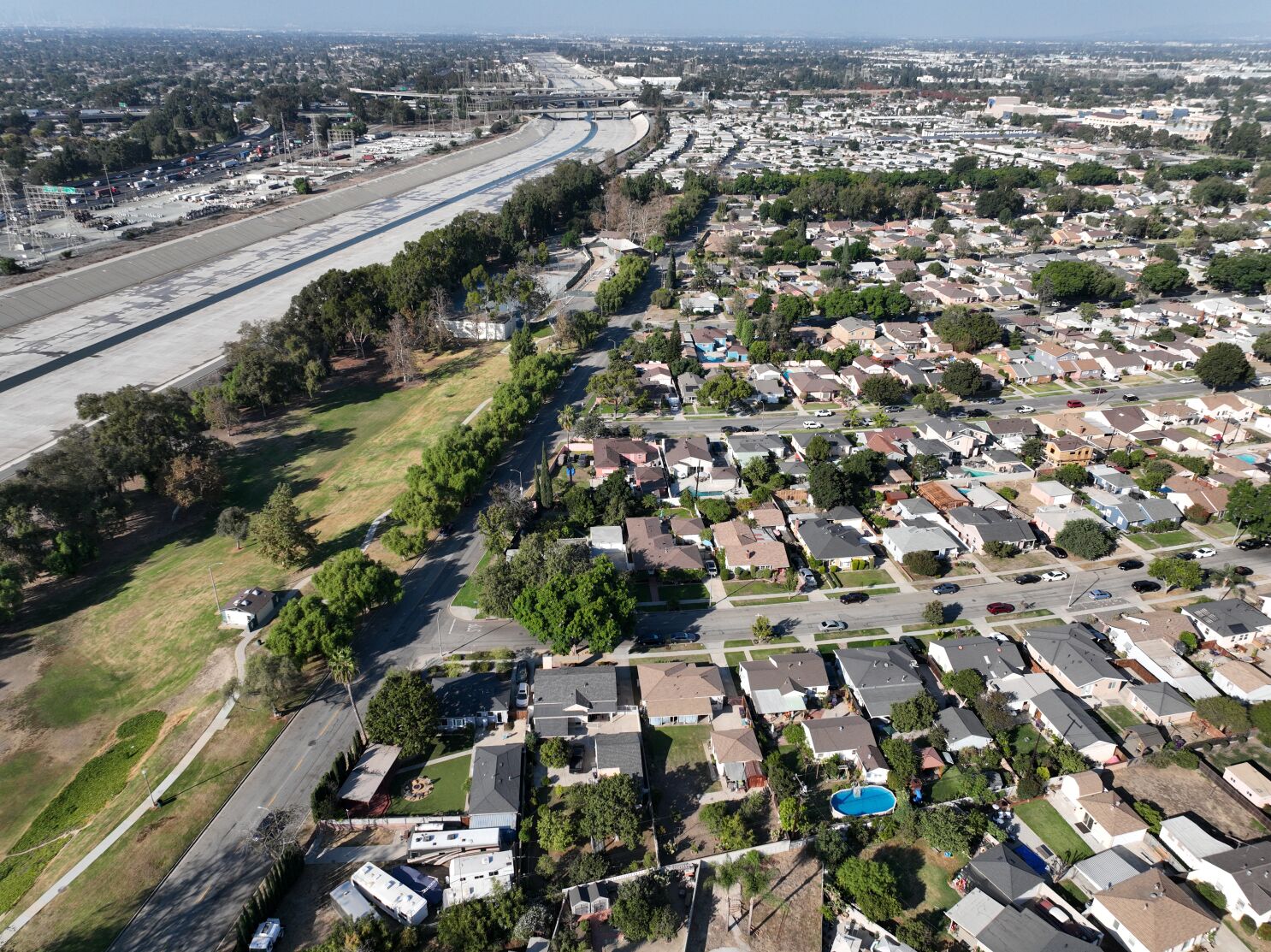 Figure 2: Los Angeles River segment in Long Beach California, where the floodplain is densely developed with housing vulnerable to flooding during a 100 year event (Photo Credit: Allen Schaben, Los Angeles Times).