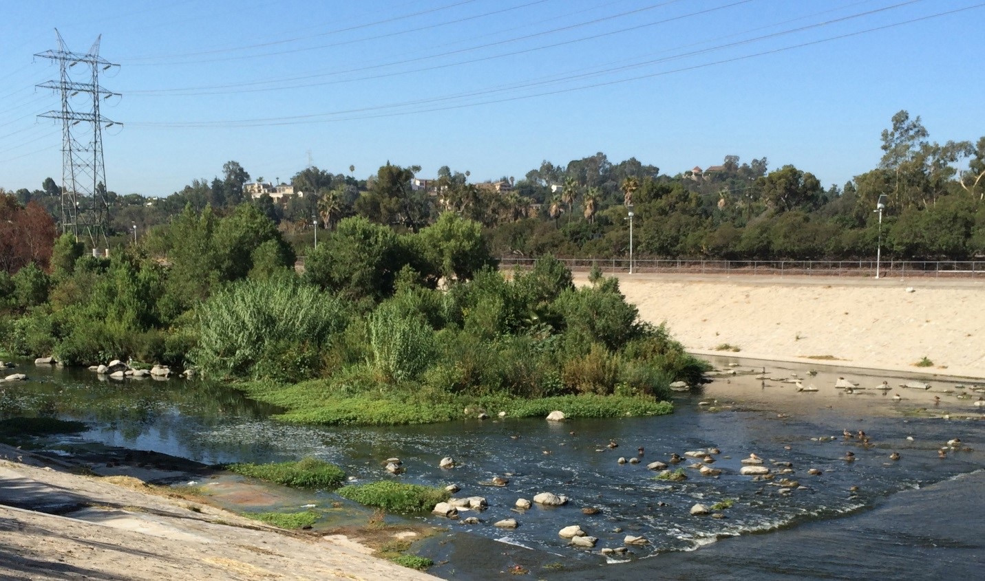 Figure 1: Segments of main stem flood channels in Los Angeles are now filled with sediment and vegetation, which reduces channel capacity for flood peaks (Photo Credit: Shona Ganguly).