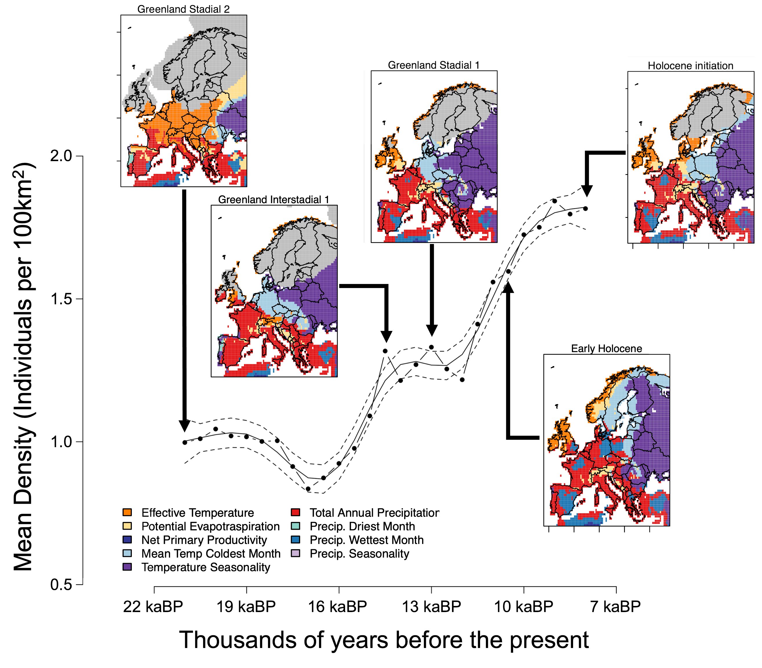 By way of serendipity Alejandro Ordonez and I are both associated with a major project led by our shared friend and colleague, Jens-Christian Svenning. His centre by the name of BIOCHANGE (Center for Biodiversity Dynamics in a Changing World: https://bio.au.dk/en/research/research-centres/biochange) is concerned with how nature and human-environment relations will change due to growing human populations, intensifying land-use, and the massive climate change projected to occur in the coming years. The nature of this work requires perspectives from multiple disciplines – and this also includes archaeology. Alejandro is a quantitative macroecologist deeply invested in understanding biodiversity issues, while I spend most of my time thinking about how the long-dead humans of the ice age adapted to the dramatic climatic changes that occurred in their time, these days in the context of my European Research Council-funded project CLIOARCH (Riede et al. 2020; https://cas.au.dk/en/erc-clioarch). Over time, over a bunch of meetings and many a cup of coffee, we began to discover a shared interest in quantifying and hence qualifying these Late Pleistocene population dynamics, and in this way, to better understand patterns and processes of adaptation.