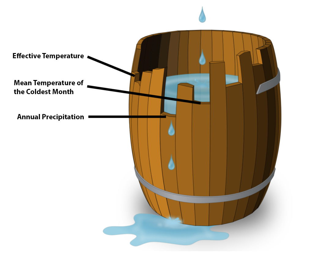 The shortest stave. A barrel is often used to visualise the idea of limiting factors. Each stave represents a given factor – temperature, precipitation and their many variations – and the shorter the stave, the leakier the barrel. The shortest stave will be the dominant limiting factor.