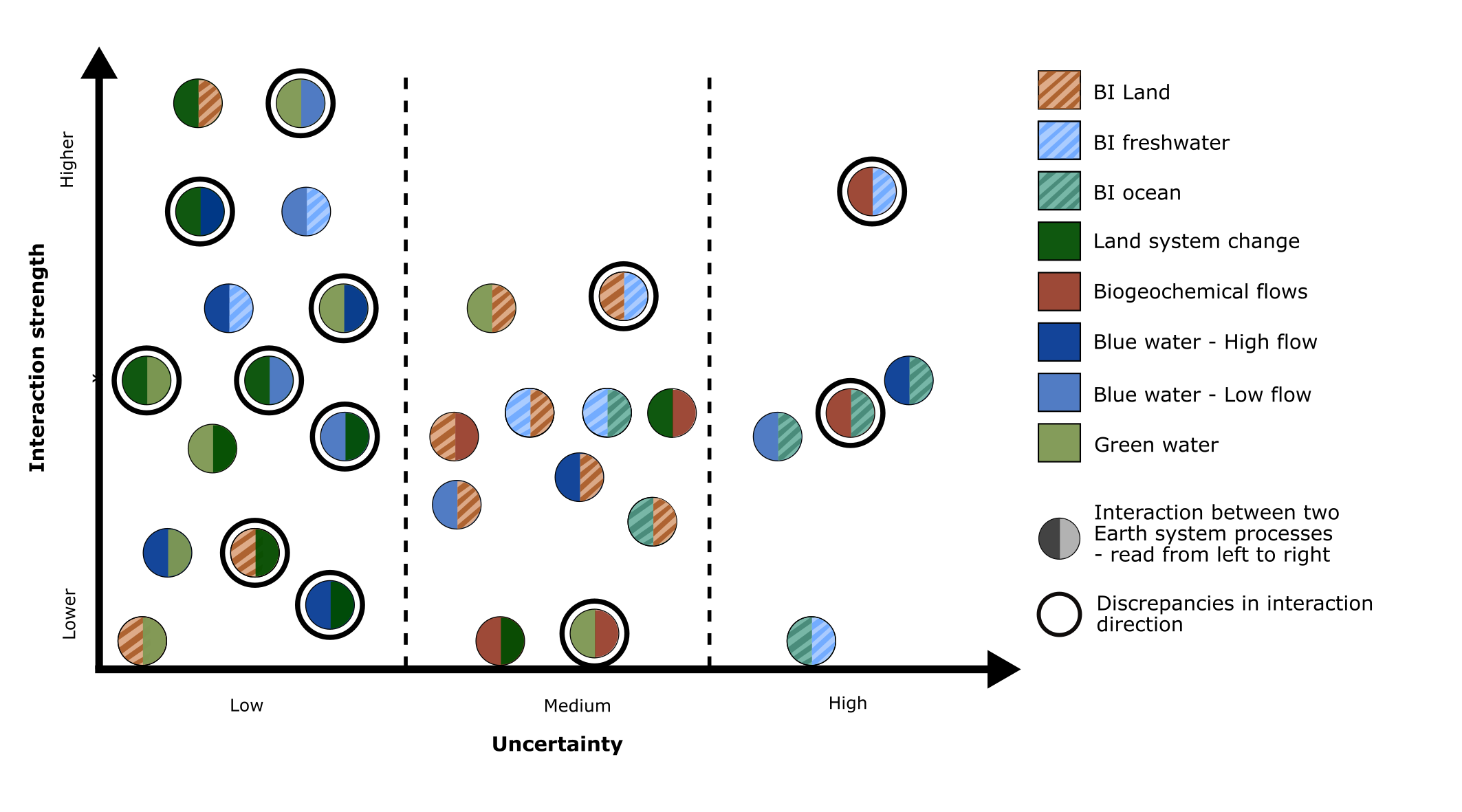 After two rounds of quantitative elicitation, a discussion round in between, and substantial double-checking and number crunching, we got what we had aimed for: the interaction strengths and mediating mechanisms. Out of a total 54 possible interactions, 37 were identified. This shows the highly interconnected nature of the selected control variables at the local scale. Many results were expected, as some interactions are well-known, such as the interactions between Land system change and BI Land. We could clearly distinguish processes that most prominently drive changes in others, especially Land system change and Green water – which is just about to be added in the PBs framework. Supporting the placement of Biosphere integrity as a core PB, we found strong interactions leading to changes in all BI components. Especially, the aquatic BI components were found to be strongly affected by changes in Blue water, Biogeochemical flows, and BI land. For instance, BI freshwater can be highly affected by increased nitrogen concentration in surface waters and decreased river discharge. On the opposite side, degrading BI Freshwater can substantially affect BI Land and BI ocean through trophic interactions between the three BI components. Zooming in at the local scale unveiled these – and many other – interactions that had gone unnoticed at the global scale. This also highlights the importance of all three BI components in future research. Our full network of interactions enables analyzing cascades and expected changes in many Earth system processes in case one is altered.