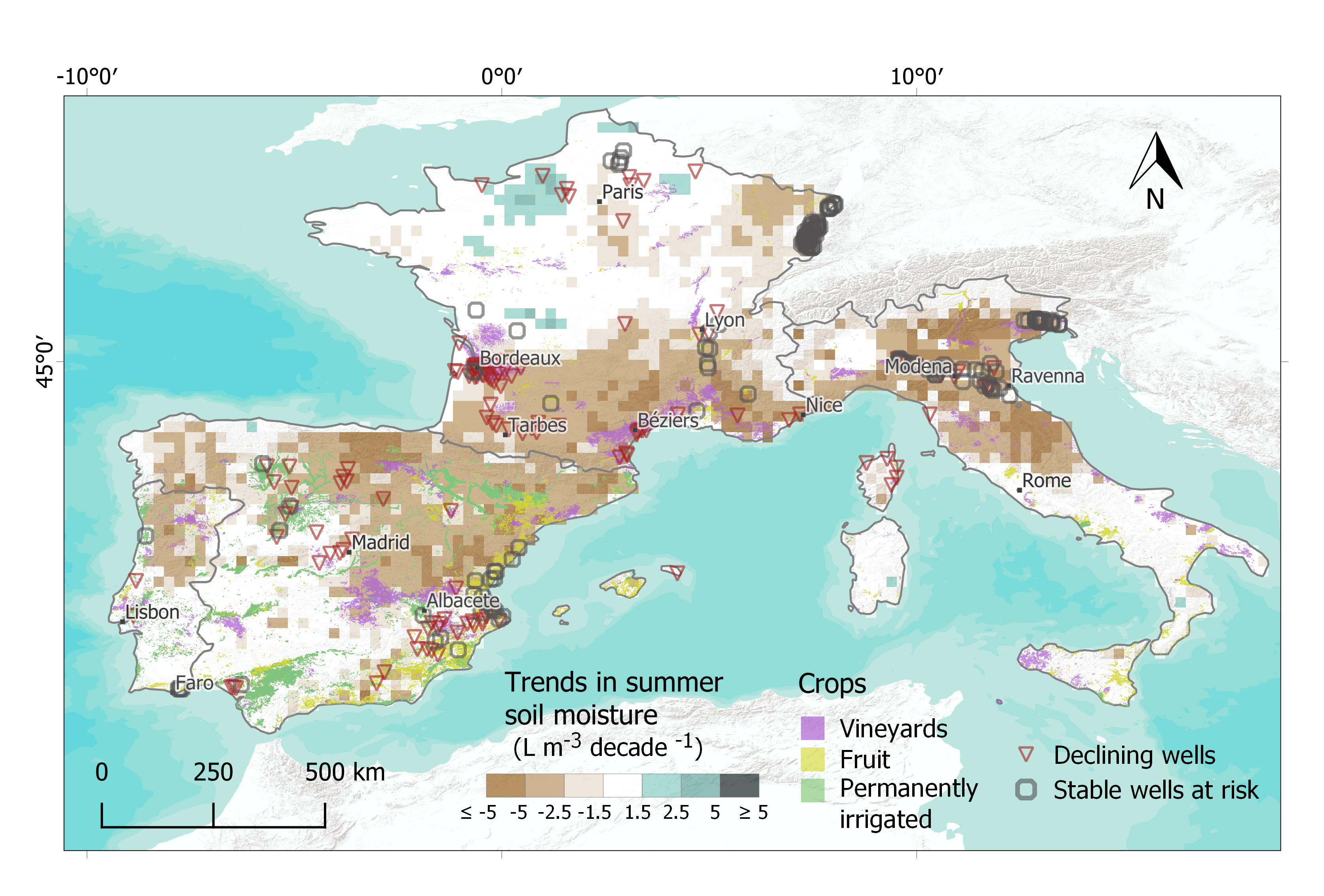 As climate change continues to reshape global water resources, southwestern Europe already faces increasing droughts and dwindling surface water and soil moisture1-4. Groundwater, a critical buffer for both drinking water and irrigation, has become an indispensable resource in this region5-9. Yet, despite its importance, comprehensive regional assessments of groundwater trends using on-the-ground measurements have been largely absent. This gap in understanding motivated us to investigate the status of groundwater in Portugal, Spain, France, and Italy, countries that are key contributors to Europe’s agricultural production and that heavily rely on groundwater for irrigation and drinking supplies.