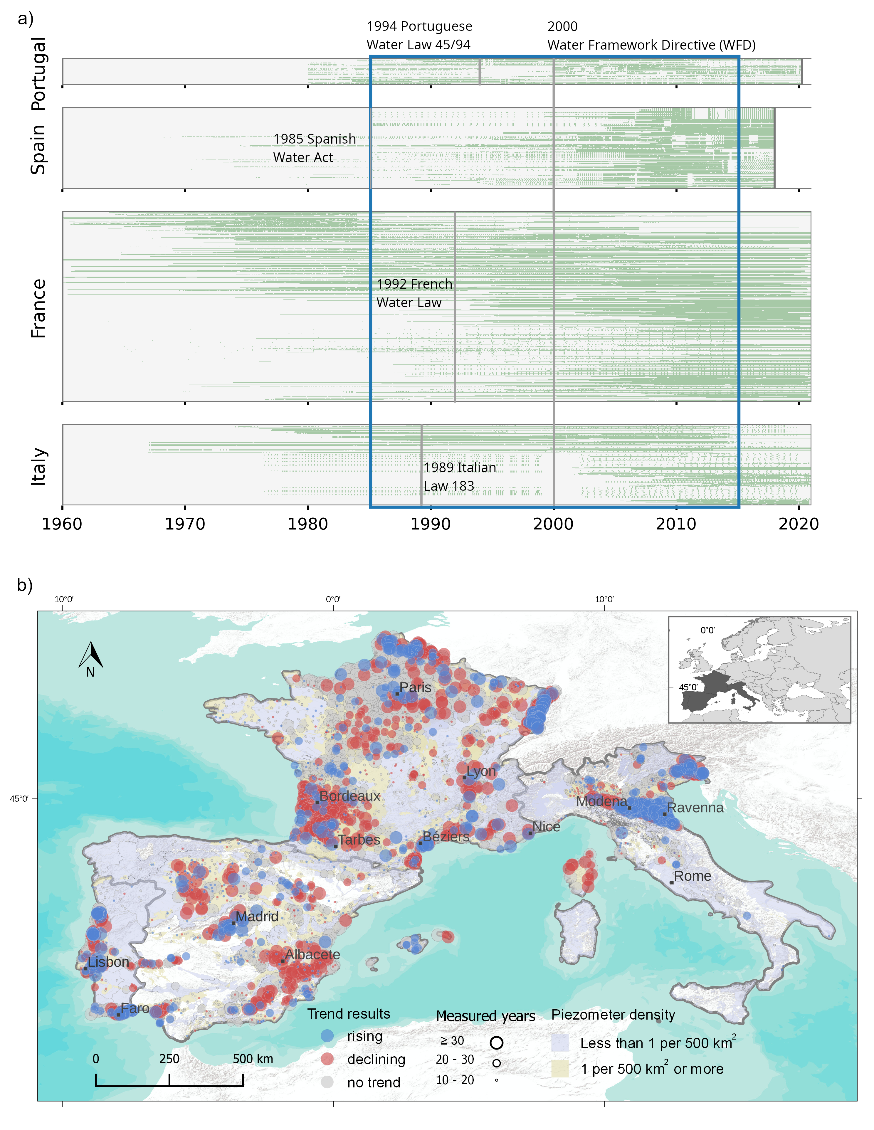 Despite these obstacles, we succeeded in gathering data from over 12,000 wells, creating the most comprehensive groundwater dataset for southwestern Europe to date. The experience of gathering and harmonizing this data underscored the need for improved groundwater monitoring systems across the region. Systematic, easily accessible data is crucial for understanding groundwater trends and for making informed decisions about water use and conservation. In this regard, our work not only contributes to the scientific understanding of groundwater in southwestern Europe but also advocates for more robust monitoring and data-sharing practices.