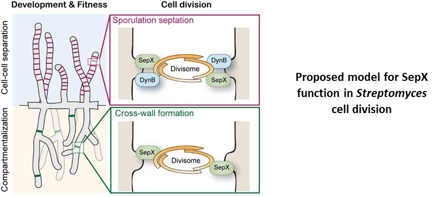 Since SepX is a membrane protein with no obvious enzymatic function, we reasoned that it is likely to perform a scaffolding function, bringing other key components of the division machinery into play. We found that SepX co-purifies and interacts with the sporulation-specific cell division component DynB (Dynamin-like protein B). We previously showed that DynB functions to stabilise Z-rings during sporulation via further interactions with other division components (Schlimpert et al., 2017). While both sepX and dynB single mutants do sporulate, a sepXdynB double mutant forms very few viable spores. This underlines the collective importance of SepX and DynB in the scaffolding of the divisome and stabilisation of Z-rings during sporulation.