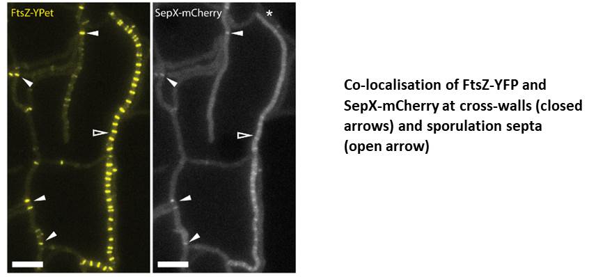 To address these questions, I went in search of novel components of the Streptomyces divisome important for cross-wall formation and sporulation. Previously, I had spent time defining the regulatory networks that underpin the Streptomyces developmental cascade. Using Chromatin Immunoprecipitation-sequencing (ChIP-seq) I identified all the genes under the control of two key transcription factors (WhiA and WhiB) that are essential for sporulation in Streptomyces (Bush et al., 2013; Bush et al., 2016). WhiA and WhiB co-activate the transcription of several genes encoding core members of the bacterial cell division machinery including ftsZ but we reasoned that other genes important for cell division might also be under WhiAB-control. I constructed and screened a series of strains expressing fluorescently tagged WhiAB-target proteins, searching for those that co-localise with FtsZ at future sites of cell division. This is how we came to identify sepX, encoding a novel component of the divisome in Streptomyces required for compartmentalisation and sporulation.