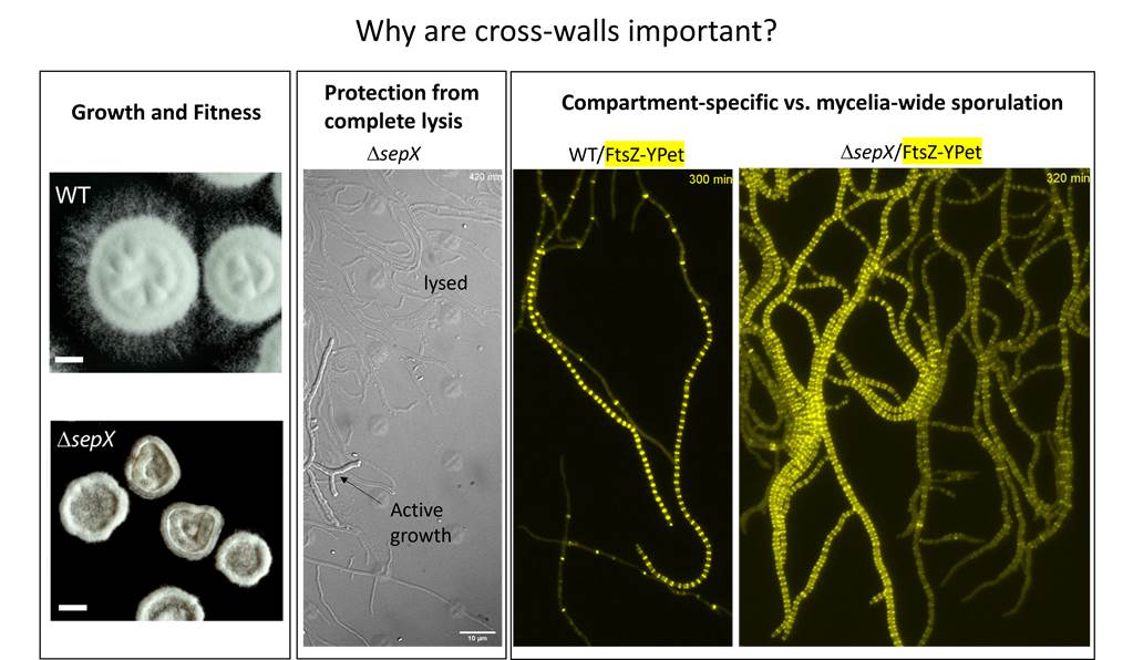 It was an exciting moment when I first noticed that deletion of sepX leads to a complete loss of cross-walls and multicellularity during vegetative growth, leading to giant filamentous cells that shared a continuous cytoplasm. This was a landmark finding since SepX turned out to be the first component of the division machinery (apart from FtsZ itself) that is specifically required for cross-wall formation.