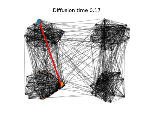 Our idea was to replace the notion of the neighbourhood of points x, y by diffusion processes started at points x, y. The diffusion processes distribute mass unevenly and on all nodes, rather than just the neighbours, which makes the problem more interesting. In the following figure, the red lines show the edge connecting to two points and the orange and blue semi-circles show the evolving diffusions. One can see that the diffusions stay trapped in well-connected regions of the network for some time before spreading to the rest of the network. In Ollivier's definition, the distance between neighbouring points is equally weighted because all neighbours carry the same mass. By considering diffusions, we place different importance on different pairs of points, i.e., different amounts of mass are placed over nodes as given by the size of semi-circles. Moreover, as the diffusions propagate, the dynamic geometry captures increasingly coarser features of the network. Therefore, instead of a single geometric object (like in classical Ollivier-Ricci curvature), we obtain a family of geometric objects parametrised by the time of diffusion.