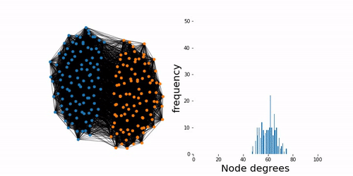 To take this idea further, we looked for ways to modify the information flow between clusters. We accomplished this in two ways. First, we changed the ratio between the number of edges between clusters to that within clusters, called the edge density ratio r. A low edge density ratio means that it is hard for the diffusions to pass from one cluster to another, essentially creating more contrast between the communities. Second, but more subtle, we reduced the number of edges in the graph while maintaining the edge density ratio. This has the effect of reducing the mean degree k, the average number of edges connected to each node. The figure below illustrates on a graph with two clusters that as we remove more edges the communities become less distinguishable.