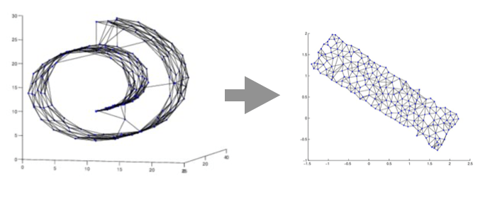 While embeddings are useful they also have their dangers. In fact, for many networks, embedding their nodes into any normed vector space will necessarily lose much of the information encoded in the connectivity. More precisely stated, the process of embedding stretches and shrinks the edges between pairs of edges by amounts that are comparable to the length of the edge itself. Many techniques in the field of non-linear dimensionality reduction deal with cleverly 'distributing' these distortions such that relevant features of the data are preserved, while others are lost. For example, the t-SNE method, which is popular at the time of writing this text, aims at preserving distance between nearby points, while allowing points far away to be embedded arbitrarily. However, in many cases, this is more of an art and it is currently not well understood what features of the network one should preserve to create meaningful embeddings.