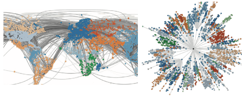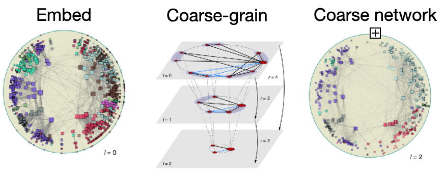 Having a space in which the network can be laid out, a so-called embedding space turns out to be very useful to analyse networks. For example, by assuming that the network’s nodes follow a continuous structure (manifold approximation) connections respecting this continuity can be preserved while those violating it may be ignored. This assumption allows unfolding the network in a 2D embedding space, which is often very useful to reveal its structure. A second example relates to complex networks, which are networks obeying power-law degree distributions. García-Pérez and colleagues found that nodes in complex networks can be naturally embedded in hyperbolic space, commonly known from M.C. Escher drawings. Remarkably, when nodes are clustered based on proximity in hyperbolic space, the community structure is preserved. In other words, the network structure is invariant under hyperbolic geometry. Finally, without an embedding space, there is no inherent notion of direction (such as left or right) in a network making it harder to understand the spreading of information. Thus finding an embedding space may also be used to study the spreading of dynamical processes in networks, such as epidemics. Helbing and colleagues studied the spreading of infectious diseases on networks by defining an effective distance that maps the nodes into a space where the wavefront started at a given node reaches the points at the same time at a given radial distance. Using this distance to map the network into 2D space revealed node communities in which the infection started at a given point in the network arrives at the same time. Such information is very useful for controlling the infectious process by blocking targeted edges.