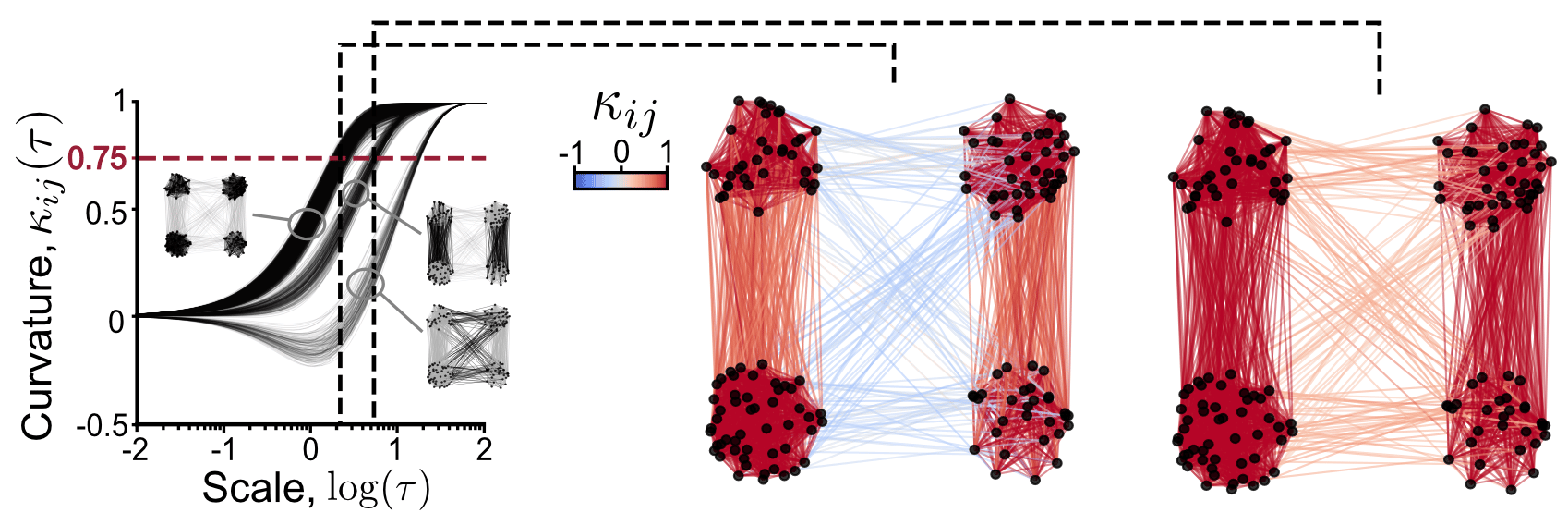 In our work, we found that the differences in the curvatures of bundles can be related to the rate of information exchange between diffusions. This is mathematically characterised by the rate of mixing of diffusions. More precisely, when the curvature reaches 0.75, as shown by the red dashed line, the corresponding pair of diffusions have mixed well. Note, they have not fully dispersed yet (they are not at stationarity). Instead, from this point in time onwards, they will move together until the dispersed state. Looking at the points in time where some diffusion pairs have mixed, shown by the vertical dashes, one can find edges that have still a long way until mixing. We call these curvature gaps that indicate bottlenecks in information flow. These bottlenecks can be visualised too! In the middle figure, we see that the curvature is lower between clusters than within clusters. In the right picture, the curvature is similar for edges within clusters and across the top and bottom clusters, while lower for those between the left and right clusters. These patterns reflect different scales in the graph revealed completely geometrically!