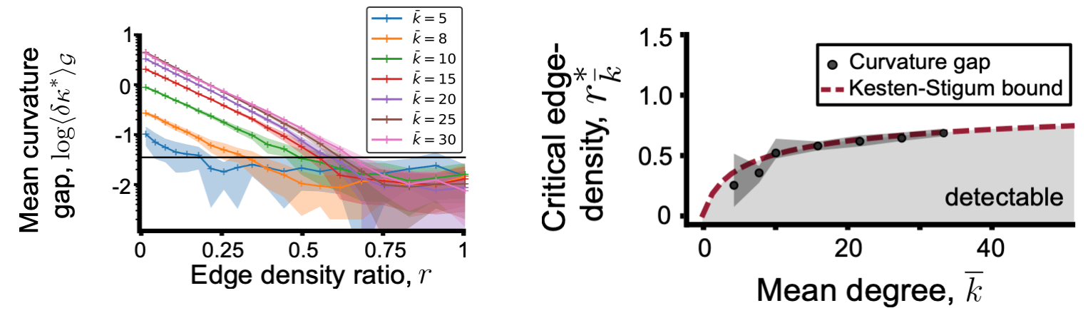We then simulated many such graphs for different mean degrees (k) and edge density ratios and computed the curvature gap. From the following figure, it is clear that when the mean degree is lower, a lower edge density ratio suffices to establish a curvature gap. This observation makes sense: the fewer edges the graph has, the larger the contrast needs to be to find communities reliably. As the edge density ratio increases, the curvature gap is no longer different from background noise, shown by the black horizontal line. What is more surprising is that the point at which the curvature gap disappears for a given average degree is the final point when the edges can convey any information about the community structure. In fact, beyond this point, known as the Kesten-Stigum bound, there is no efficient algorithm that can tell the communities apart. When we look at the distribution of the transition points for different mean degrees, the prediction of the curvature gap lies very close to the theoretical prediction! In the paper, we show that this is no coincidence; in fact, the distribution of the curvatures contains all the information to recover the clusters of the graph.