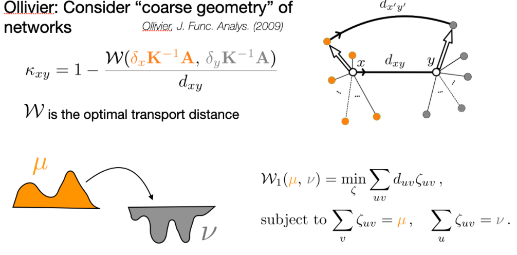 An alternative to using embeddings could be to define the geometry of the network based on analogues borrowed from differential geometry, which deals with the geometry of continuous spaces. One way to define geometry in continuous spaces is through the concept of curvature. Consider two points x, y (on a manifold) and move them in parallel in an arbitrary direction to points x' and y'. Note that depending on the geometry of the space, the transported points will be closer or further away. For example, while on a planar surface parallel lines remain parallel, on a sphere they will meet at the poles of the sphere (this reminded me of the classic riddle posed by George Pólya). Thus, by computing the average distance of points nearby x and points nearby y relative to the distance of x and y, one can define the Ricci curvature in direction xy.