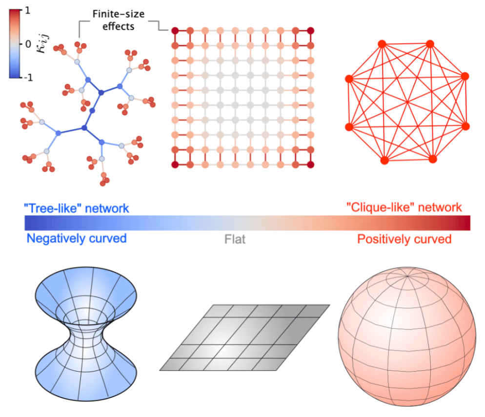 When one computes the Ollivier-Ricci curvature only between adjacent nodes on the network (endpoints of an edge), it turns out to be remarkably intuitive. There is a deep analogy between the curvature of canonical networks and canonical geometric spaces, as illustrated by the figure below.